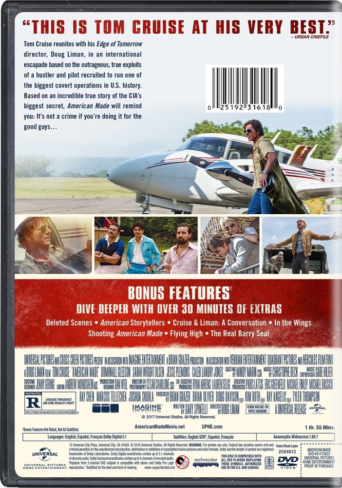 Further Details Title: American Made Format: DVD Condition: New Number Of Discs: 1 Release Date: 01/02/2018 Actors: Tom Cruise, Domhnall Gleeson, Sarah Wright Olsen, Jesse Plemons, Caleb Landry Jones Director: Doug Liman Audio Language: English, Spanish Runtime: 1 hour and 56 minutes Region Code: DVD: 1 (US, Canada...) Studio: Universal Pictures Home Entertainment Subtitle Language: Spanish, French Certificate: MPAA R Description: Tom Cruise reunites with his Edge of Tomorrow director, Doug Liman, in an international escapade based on the outrageous, true exploits of a hustler and pilot recruited to run one of the biggest covert operations in U.S. history. Based on an incredible true story of the CIA's biggest secret, American Made will remind you: Its not a crime if you're doing it for the good guys. Bonus Content: * Deleted Scenes * Cruise & Liman: A Conversation * American Storytellers * In the Wings * Flying High * Shooting American Made * American Made: The Real Story * Feature Commentary ]]> DVDs ARE REGION 1 UNLESS OTHERWISE STATED Missing Information? Please contact us if any details are missing and where possible we will add the information to our listing.