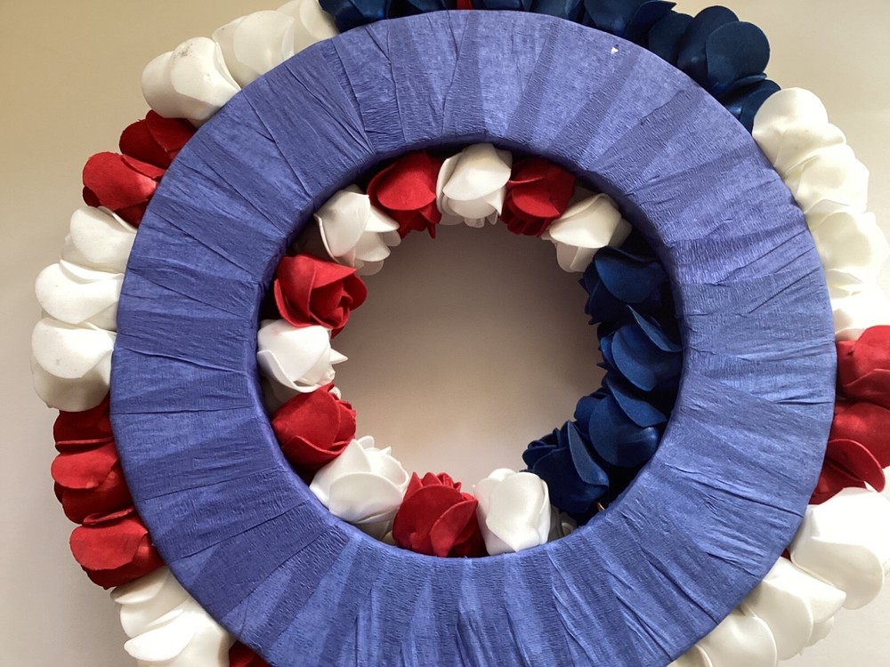 American Patriotic Floral Flag Front Door Wreath 13 inches Roses are made from heavy duty foam Stars are Metal Backing is covered styrofoam Silk ribbon for hanging Very light, easy to hang Very pretty, well made Could be used to lay on casket Could also be used to decorate grave stone but would not hold up long in rain Plastic bag was opened for pictures