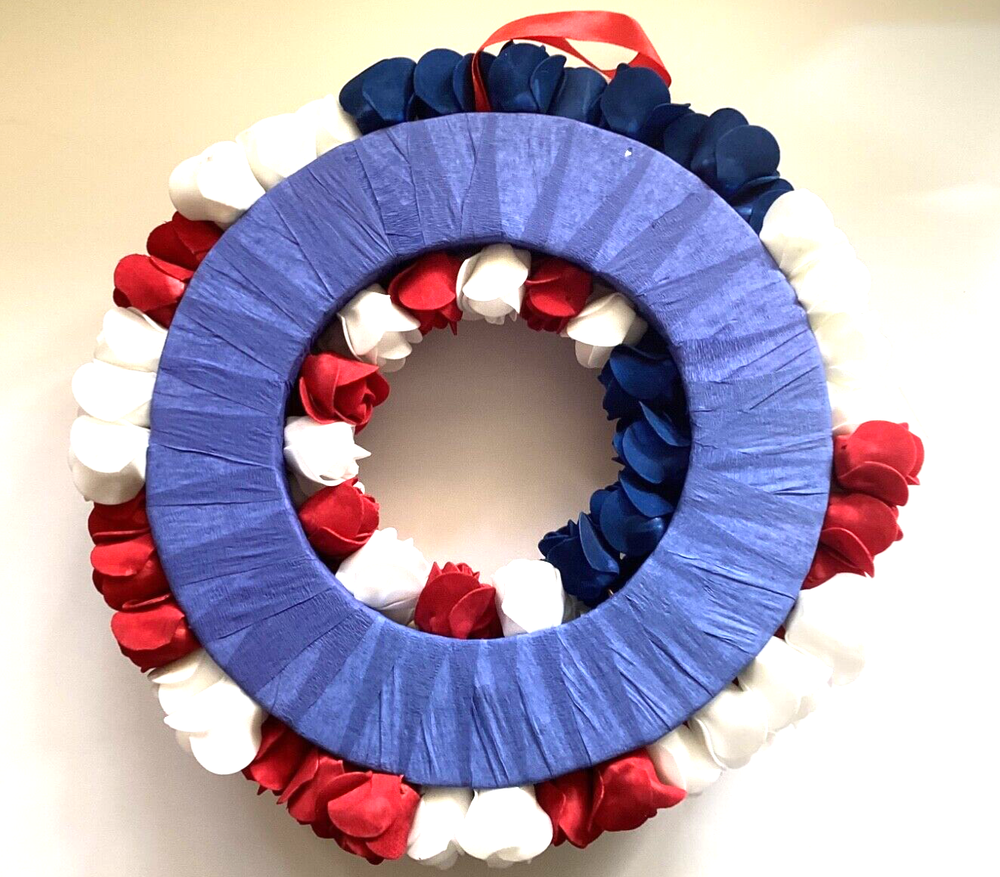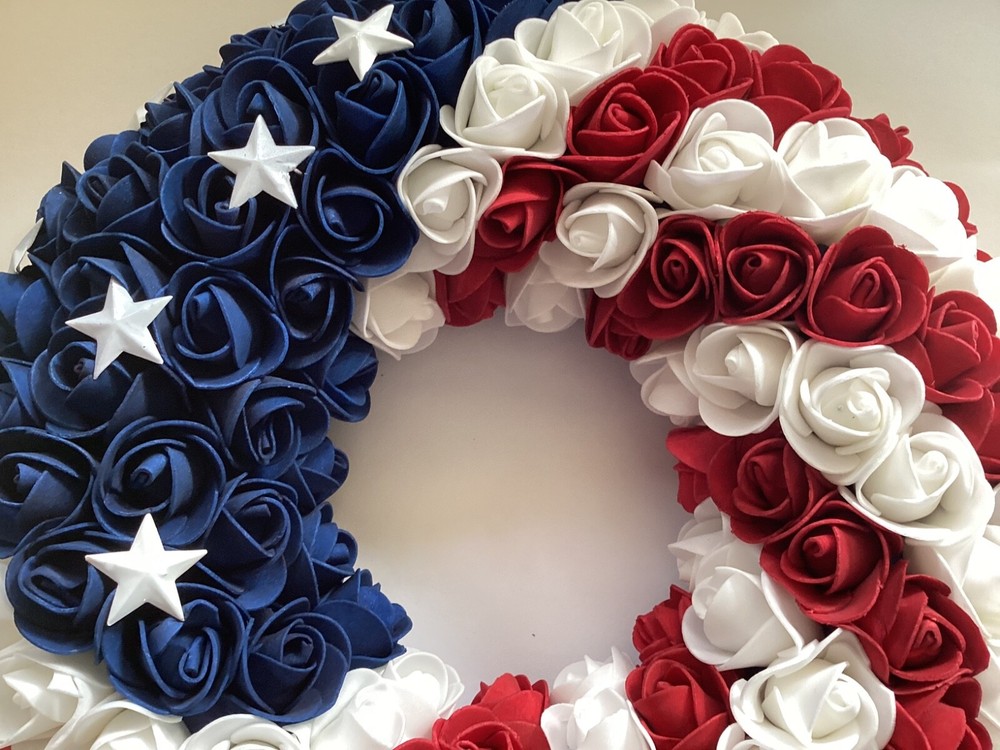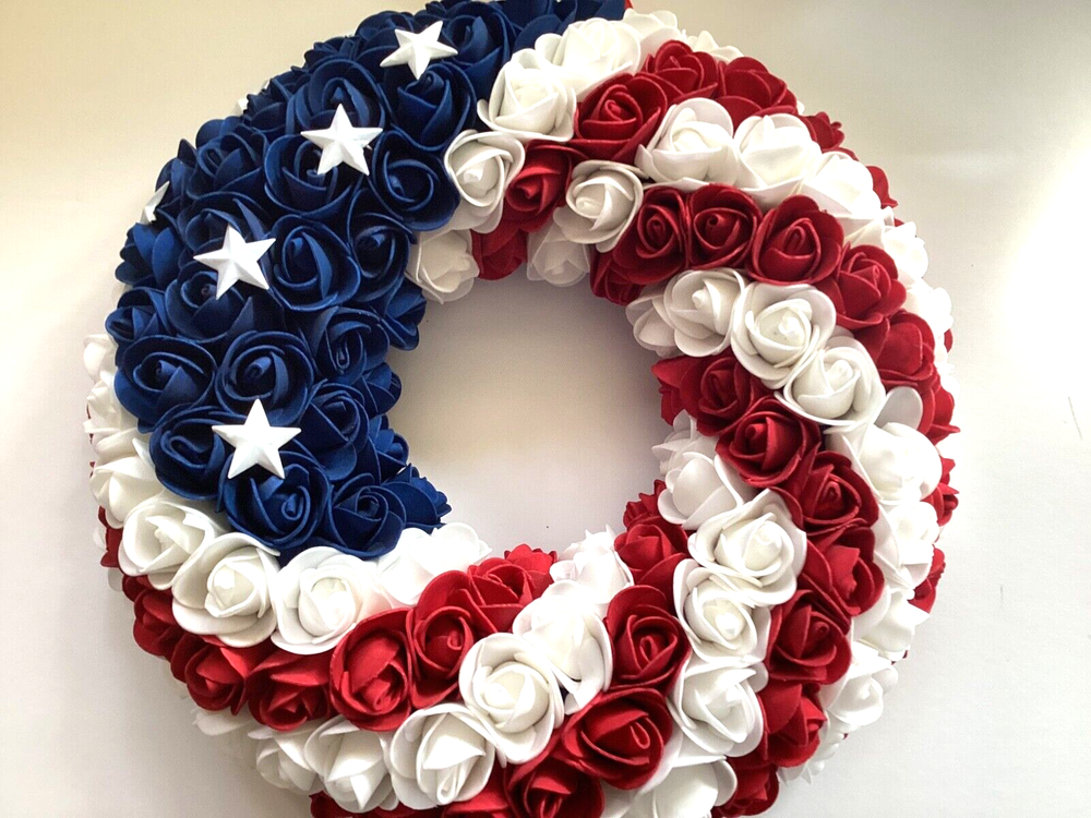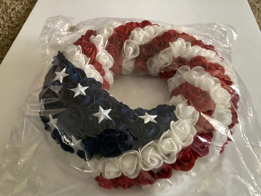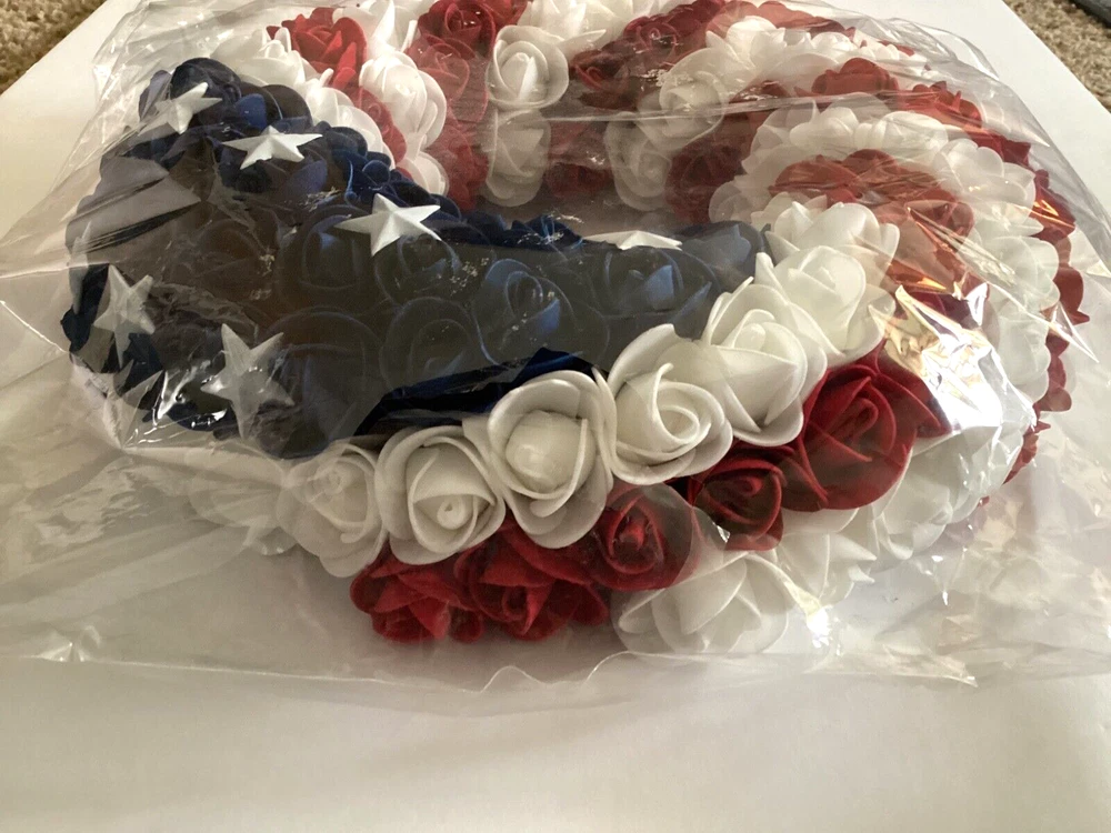 This wreath is stunning—perfect for showing patriotic pride! The foam roses and metal stars look high-quality, and the lightweight design makes hanging a breeze. The craftsmanship is impressive, and it’s versatile enough for doors, caskets, or grave decorations (though not weatherproof). Even with the bag opened for photos, it arrived in great condition. Love it!