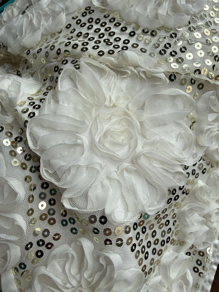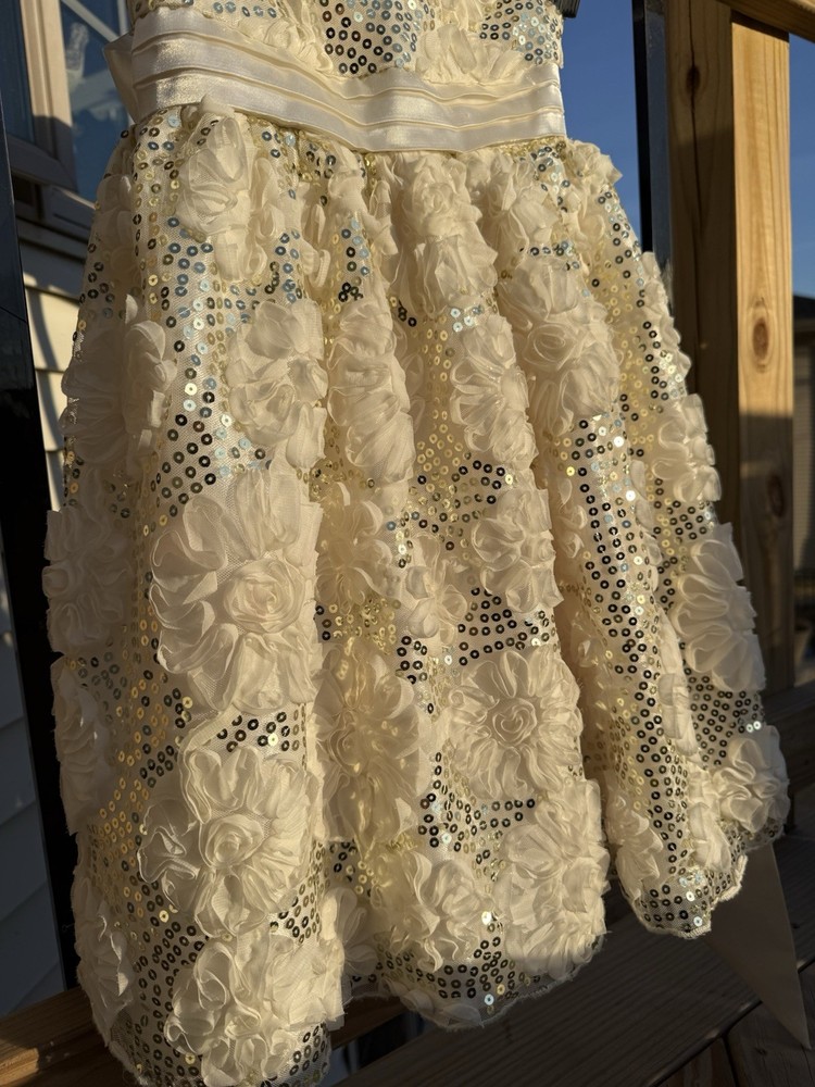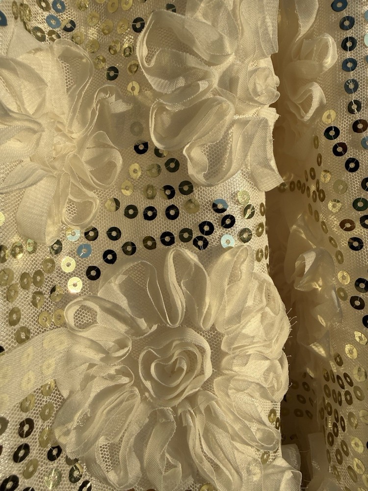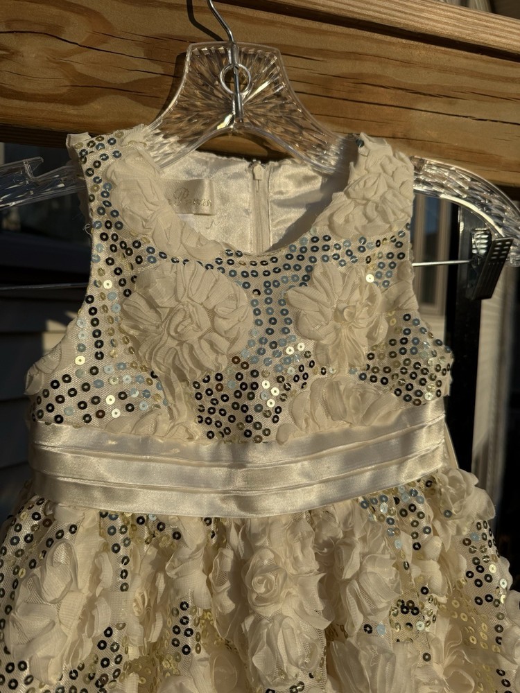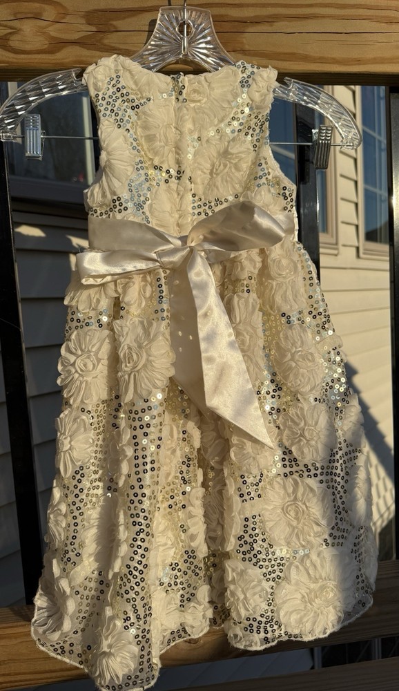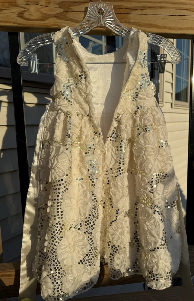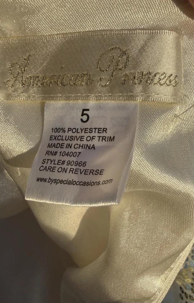 The American Princess size 5T formal dress is a beautifully embellished floral gown perfect for an Easter wedding or special occasion. The sleeveless ball gown features intricate sequin detailing, knee-length hem, and a stunning gold color that adds a touch of elegance and glamour. Machine washable for easy care, this dress showcases a delicate floral pattern that adds a whimsical touch, making it a perfect choice for young girls who want to look like a princess at their next event.