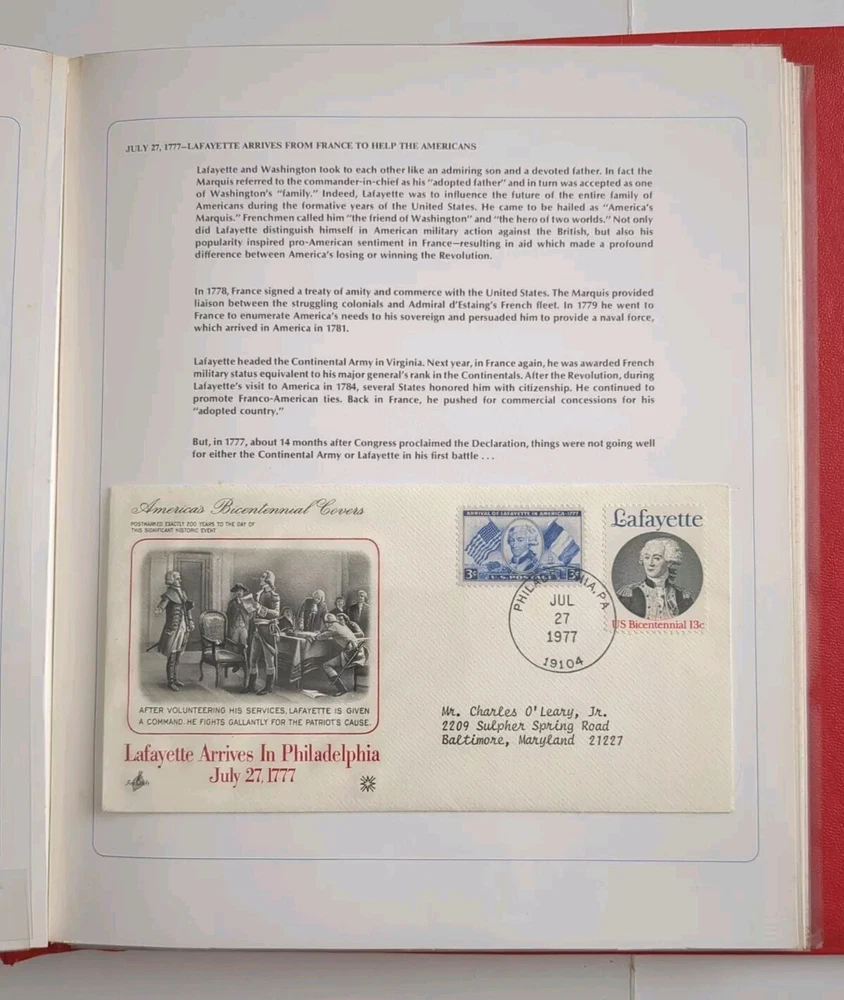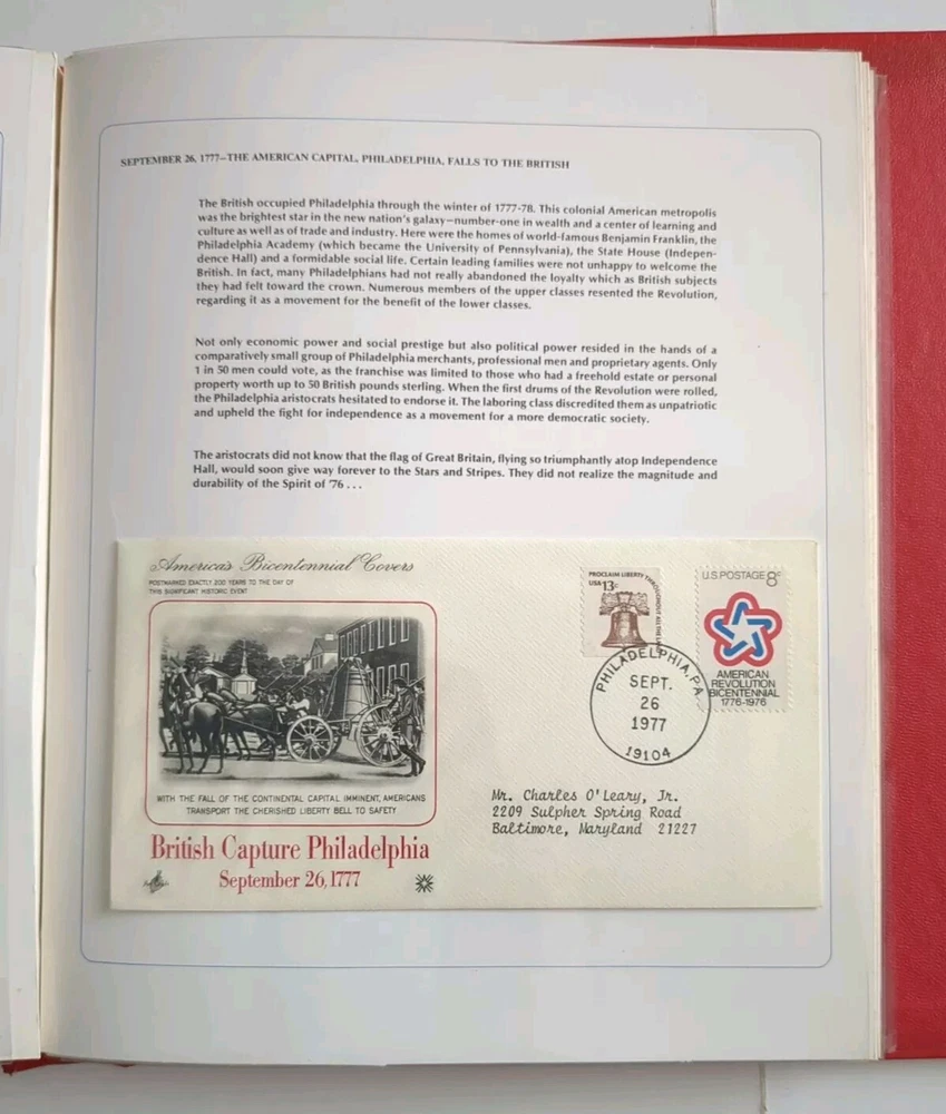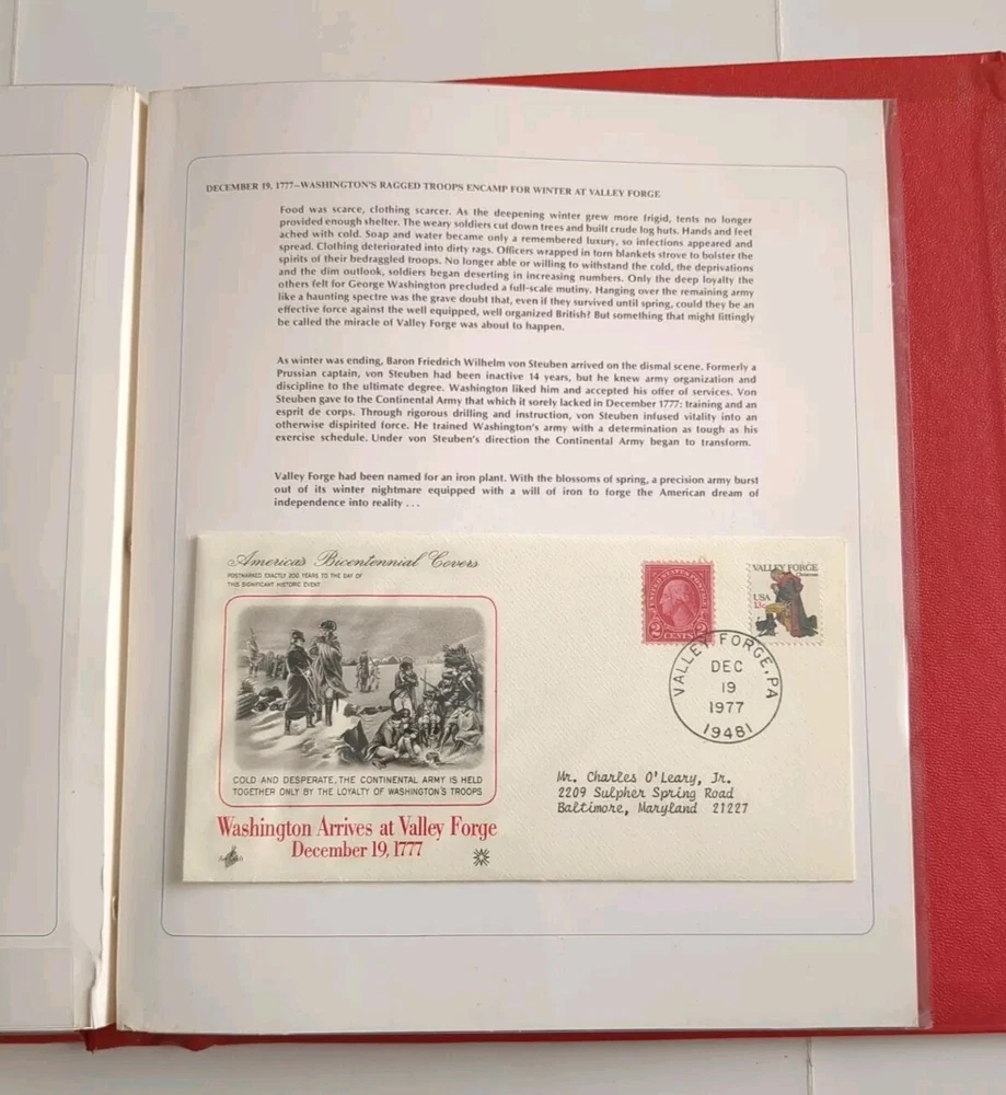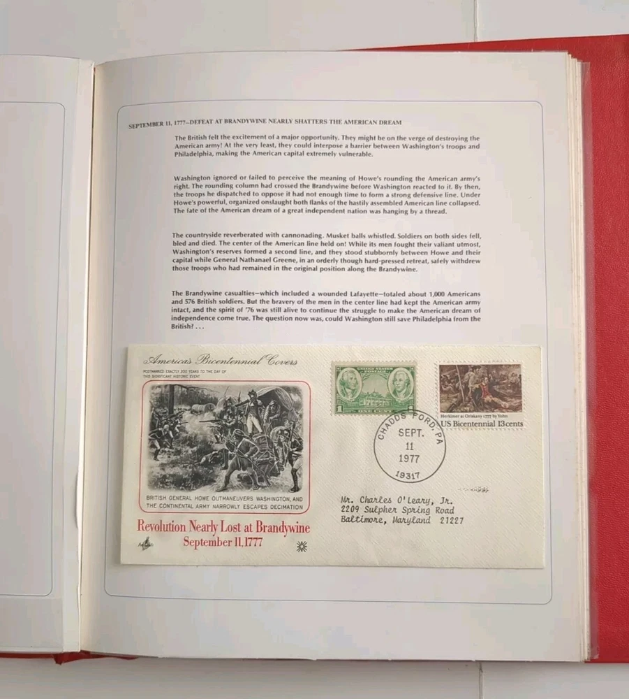 America's Bicentennial Covers Set of 9 covers for 1977 with album, informative inserts and protective sleeves. Pictures of all 9 Hamilton joins Washington British invasion from Canada First US Flag Lafayette arrives in Philadelphia Revolution nearly lost at Brandywine British capture Philadelphia Burgoyne surrenders at Saratoga Articles of Confederation Adopted Washington arrives at Valley Forge Album has some minor shelf wear Covers are very nice If you don't want the binder the shipping will reduce to a 1 lb equivalent. Message me for a quote to your zip.
