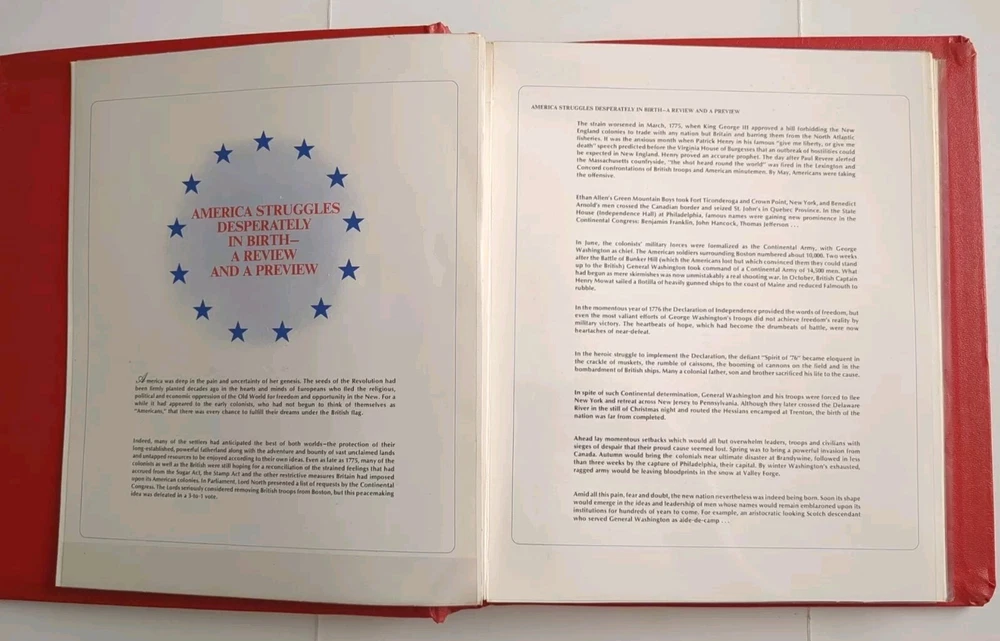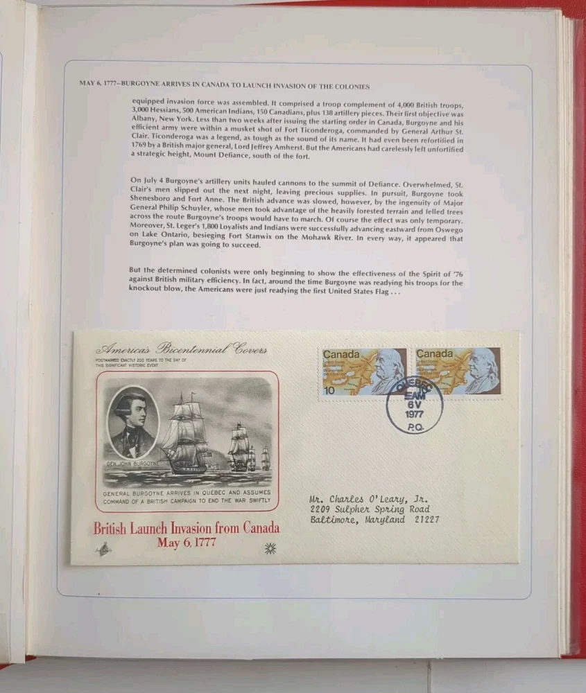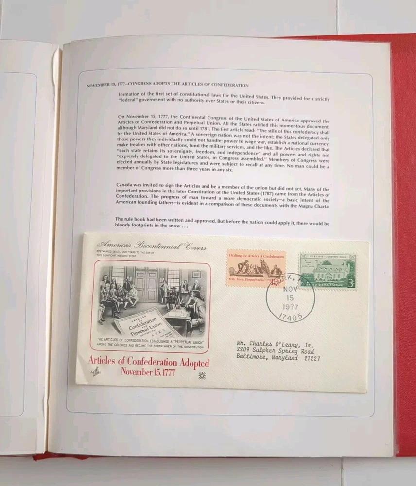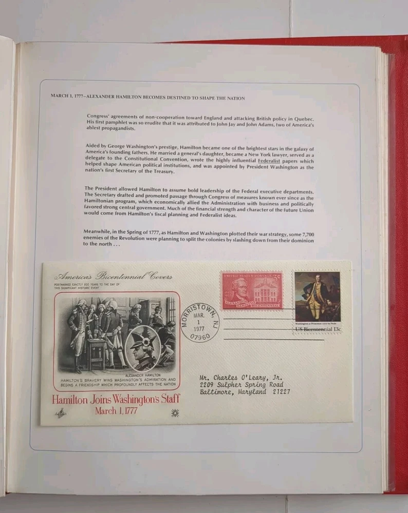 America's Bicentennial Covers Set of 9 covers for 1977 with album, informative inserts and protective sleeves. Pictures of all 9 Hamilton joins Washington British invasion from Canada First US Flag Lafayette arrives in Philadelphia Revolution nearly lost at Brandywine British capture Philadelphia Burgoyne surrenders at Saratoga Articles of Confederation Adopted Washington arrives at Valley Forge Album has some minor shelf wear Covers are very nice If you don't want the binder the shipping will reduce to a 1 lb equivalent. Message me for a quote to your zip.