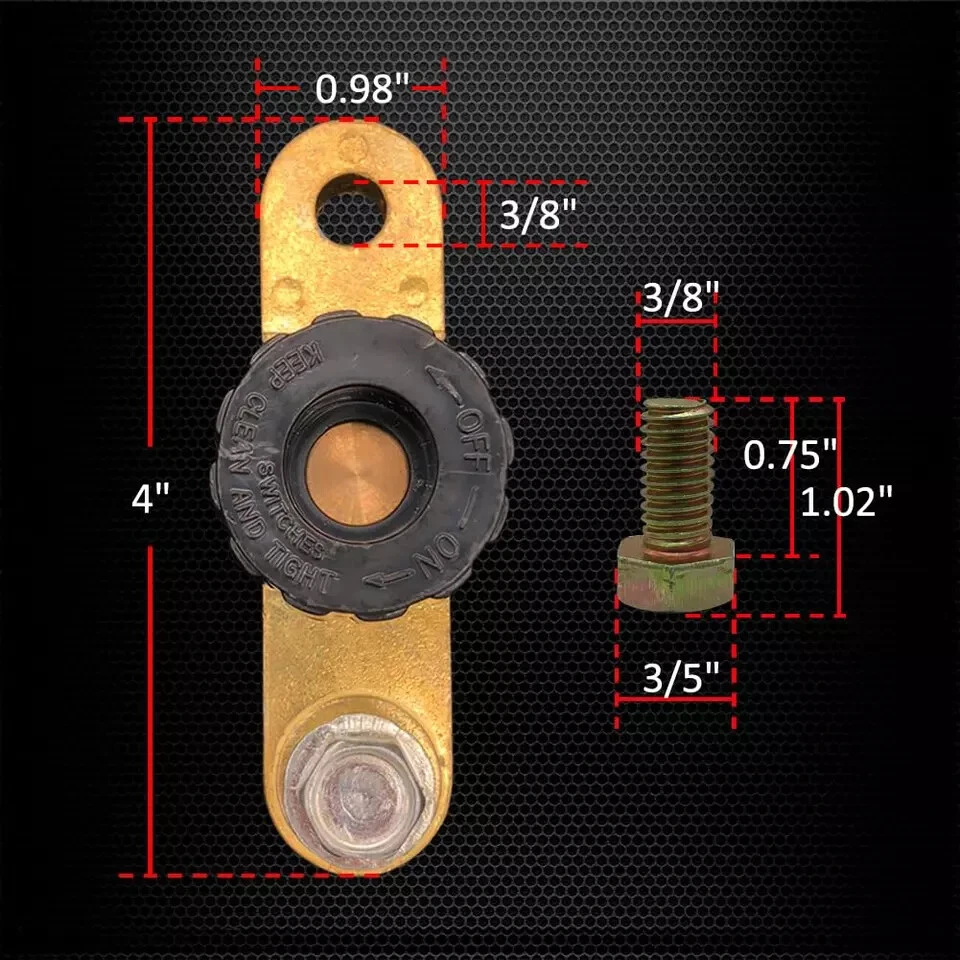 Compatible: with a long bolt, used for side post terminal, battery negative post 3/8" hole only, DC 12 V system, rated current: 125 A, On/Off 2 position. Convenience: knob type, easy to install & simple to use. Loose / twist of the knob, then power will cut. Heavy Duty: solid made, rust and corrosion resistant, durable made for safety use. Purpose: used for battery to isolate and secure the electrical system, eliminate any power draw from the battery when vehicle or boat is not in use, disconnects the battery safely. Compatible with GM side post batteries or other batteries which have a 3/8" side post terminal, also used for electrical equipment.