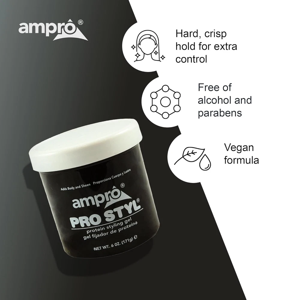 Product Description Ampro Pro Styl Regular Hold Protein Styling Gel, Moisturizing 10oz Ampro Pro Styl Regular Hold Protein Unisex Styling Gel - because you want a styling gel that gives you the perfect look the first time, every time! Our legendary vegan, alcohol-free styling gel is uniquely formulated to provide the hard, firm hold you need to achieve the styles you desire for all hair types. This gel is designed for sculpting and molding hair styles and for protective hair styles with resistant hair textures. SAY GOODBYE TO FLYAWAYS. With this wonder-working gel, you can define your natural hair and tame lose strands with a firm, non-greasy hold, while also giving your hair a fresher, healthier shine. PROTEIN RICH FORMULA. Strengthen your hair with this protein-enriched gel, to boost your hair's resilience and leave it looking and feeling healthy. It protects your hair during styling and is great for natural hair and textured styles. GOODBYE FLAKES AND GREASE. Enjoy soft, manageable waves and curls by using this non-greasy gel. The moisturizing formula is non-flaking and distributes easily throughout your hair, to help create any hairstyle on any hair texture. A LEGACY PRODUCT LINE. Ampro, which stands for American Products, is a leading beauty manufacturer, established since 1947. We produce top-quality personal care products for hair, body, and skin, free of alcohol, parabens, sulfates, and dyes. MULTICULTURAL HAIR CARE PRODUCTS. Ampro is continuously expanding its hair care line by adding exciting new products, like our Shine 'n Jam Magic Fingers, the Ampro Pro Styl Olive Oil Styling Gel, and our newest kid's line, Ampro's Beautiful Child. Ingredients Water/Aqua, Carbomer, Sodium Hydroxide, Caramel, Propylene Glycol, DMDM Hydantoin, Fragrance/Parfum, Hydrolyzed Soy Protein, Benzoic Acid, Limonene, Iodopropynyl Butylcarbamate, Coumarin, Citral, Linalool, Citronellol