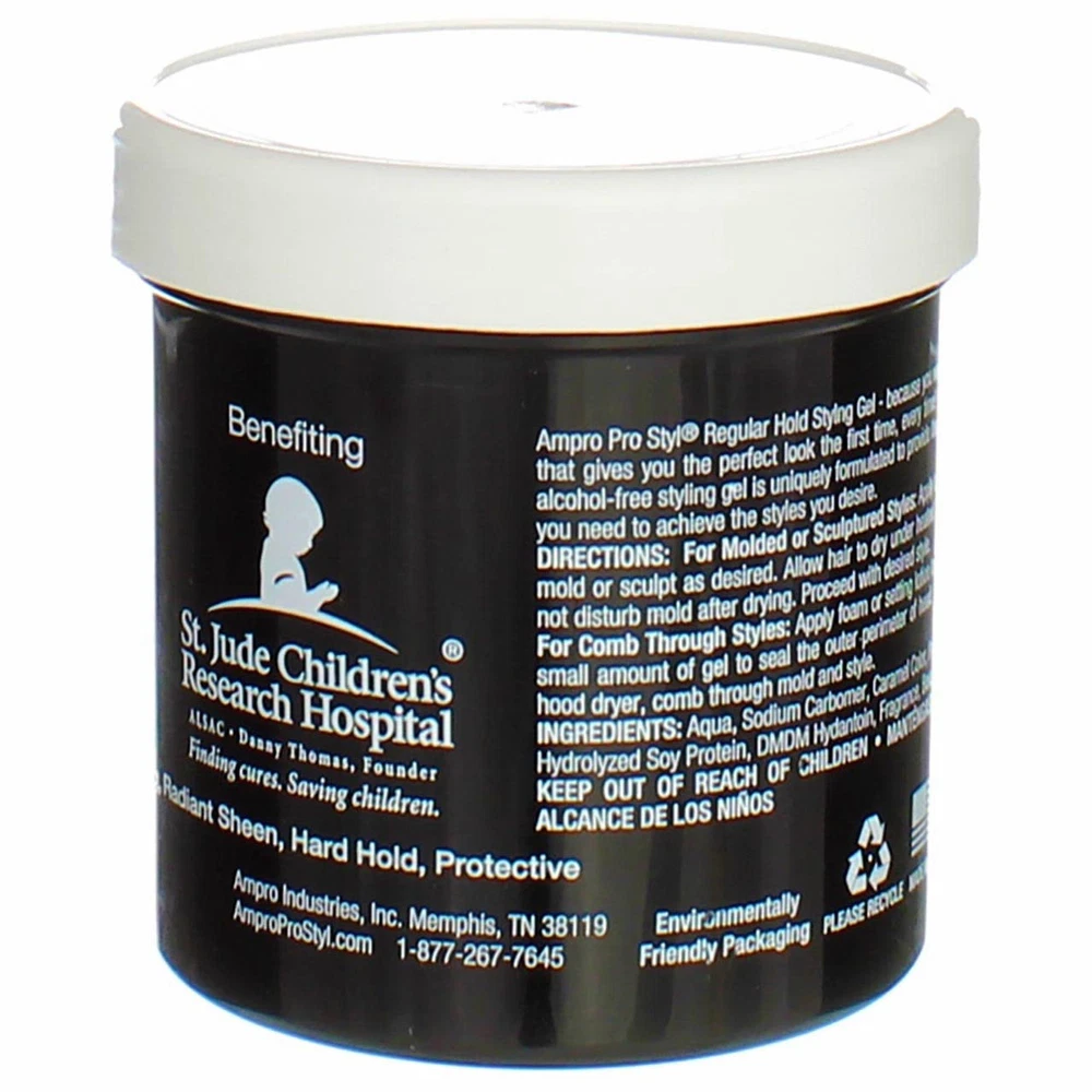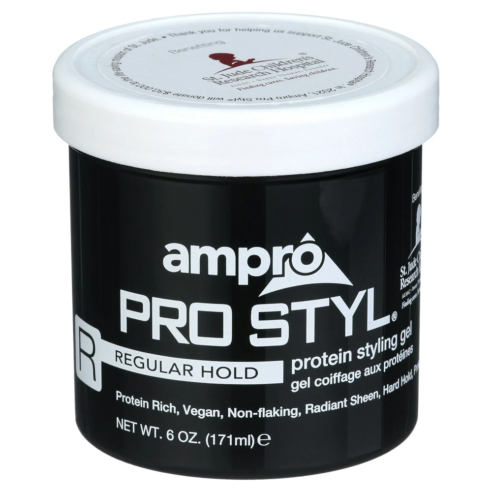Product Description Ampro Pro Styl Regular Hold Protein Hair Styling Moisturizing Gel, Unisex, 6oz (3 Pack) Ampro Pro Styl Regular Hold Protein Unisex Styling Gel - because you want a styling gel that gives you the perfect look the first time, every time! Our legendary vegan, alcohol-free styling gel is uniquely formulated to provide the hard, firm hold you need to achieve the styles you desire. This gel is designed for sculpting and molding hair styles and for protective hair styles with resistant hair textures. SAY GOODBYE TO FLYAWAYS. With this wonder-working gel, you can define your natural hair and tame lose strands with a firm, non-greasy hold, while also giving your hair a fresher, healthier shine. PROTEIN RICH FORMULA. Strengthen your hair with this protein-enriched gel, to boost your hair's resilience and leave it looking and feeling healthy. It protects your hair during styling and is great for natural hair and textured styles. GOODBYE FLAKES AND GREASE. Enjoy soft, manageable waves and curls by using this non-greasy gel. The moisturizing formula is non-flaking and distributes easily throughout your hair, to help create any hairstyle on any hair texture. A LEGACY PRODUCT LINE. Ampro, which stands for American Products, is a leading beauty manufacturer, established since 1947. We produce top-quality personal care products for hair, body, and skin, free of alcohol, parabens, sulfates, and dyes. MULTICULTURAL HAIR CARE PRODUCTS. Ampro is continuously expanding its hair care line by adding exciting new products, like our Shine 'n Jam Magic Fingers, the Ampro Pro Styl Olive Oil Styling Gel, and our newest kid's line, Ampro's Beautiful Child. Ingredients Water/Aqua, Carbomer, Sodium Hydroxide, Caramel, Propylene Glycol, DMDM Hydantoin, Fragrance/Parfum, Hydrolyzed Soy Protein, Benzoic Acid, Limonene, Iodopropynyl Butylcarbamate, Coumarin, Citral, Linalool, Citronellol