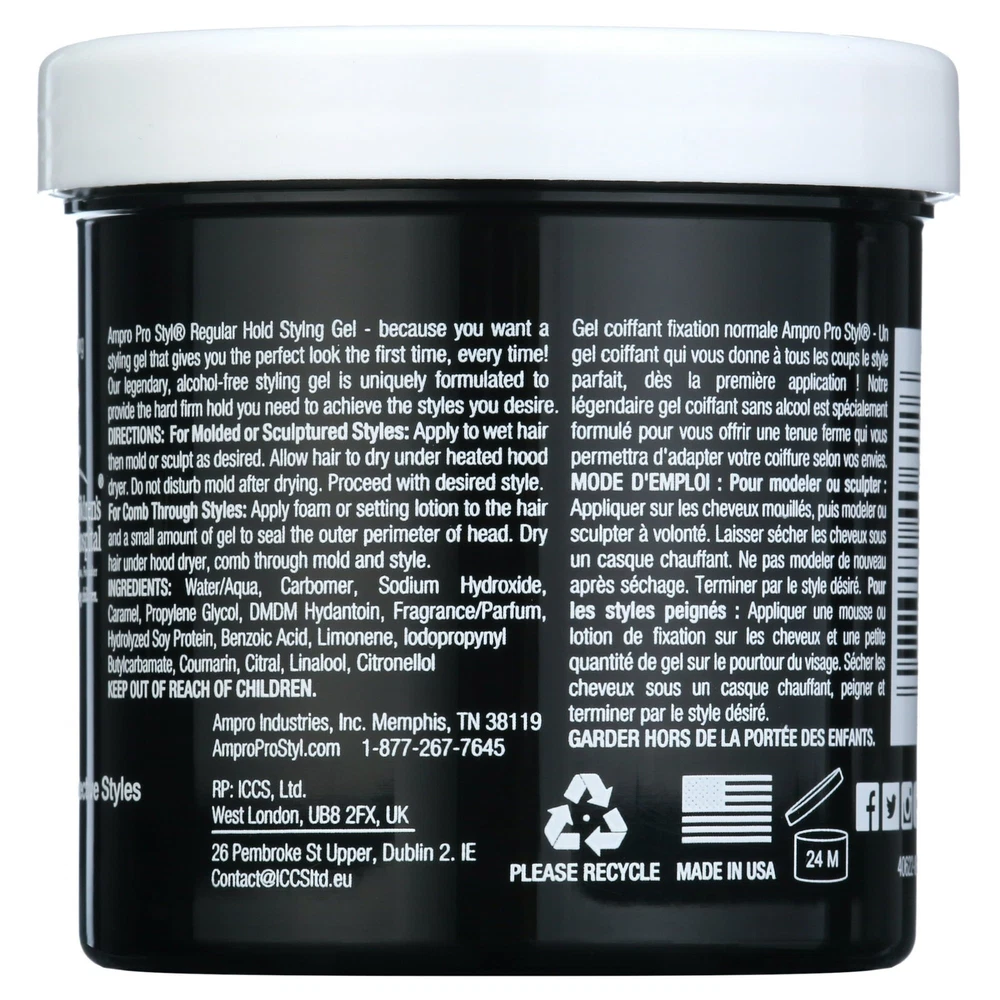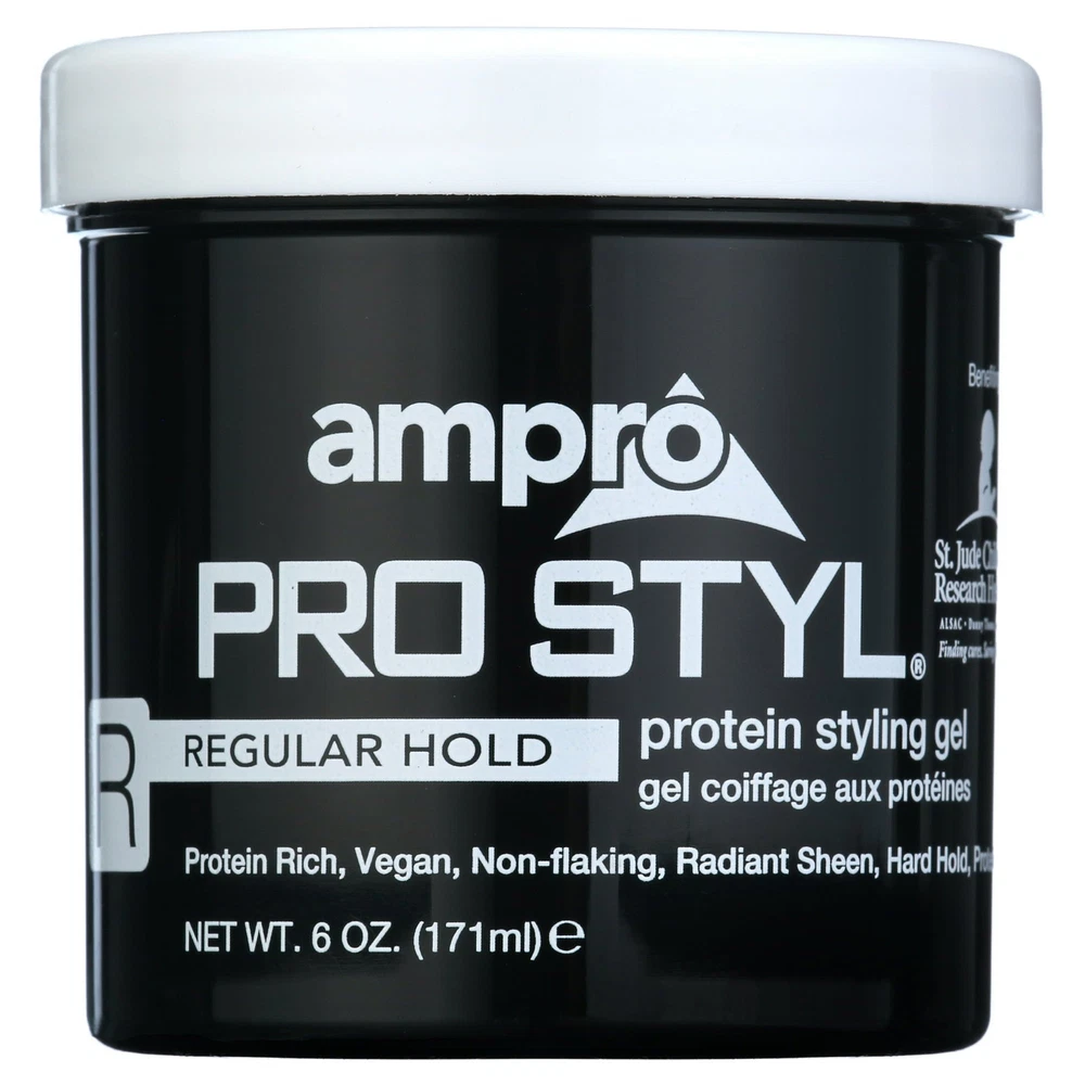Product Description Ampro Pro Styl Regular Hold Protein Hair Styling Moisturizing Gel, Unisex, 6oz (4 Pack) Ampro Pro Styl Regular Hold Protein Unisex Styling Gel - because you want a styling gel that gives you the perfect look the first time, every time! Our legendary vegan, alcohol-free styling gel is uniquely formulated to provide the hard, firm hold you need to achieve the styles you desire. This gel is designed for sculpting and molding hair styles and for protective hair styles with resistant hair textures. SAY GOODBYE TO FLYAWAYS. With this wonder-working gel, you can define your natural hair and tame lose strands with a firm, non-greasy hold, while also giving your hair a fresher, healthier shine. PROTEIN RICH FORMULA. Strengthen your hair with this protein-enriched gel, to boost your hair's resilience and leave it looking and feeling healthy. It protects your hair during styling and is great for natural hair and textured styles. GOODBYE FLAKES AND GREASE. Enjoy soft, manageable waves and curls by using this non-greasy gel. The moisturizing formula is non-flaking and distributes easily throughout your hair, to help create any hairstyle on any hair texture. A LEGACY PRODUCT LINE. Ampro, which stands for American Products, is a leading beauty manufacturer, established since 1947. We produce top-quality personal care products for hair, body, and skin, free of alcohol, parabens, sulfates, and dyes. MULTICULTURAL HAIR CARE PRODUCTS. Ampro is continuously expanding its hair care line by adding exciting new products, like our Shine 'n Jam Magic Fingers, the Ampro Pro Styl Olive Oil Styling Gel, and our newest kid's line, Ampro's Beautiful Child. Ingredients Water/Aqua, Carbomer, Sodium Hydroxide, Caramel, Propylene Glycol, DMDM Hydantoin, Fragrance/Parfum, Hydrolyzed Soy Protein, Benzoic Acid, Limonene, Iodopropynyl Butylcarbamate, Coumarin, Citral, Linalool, Citronellol
