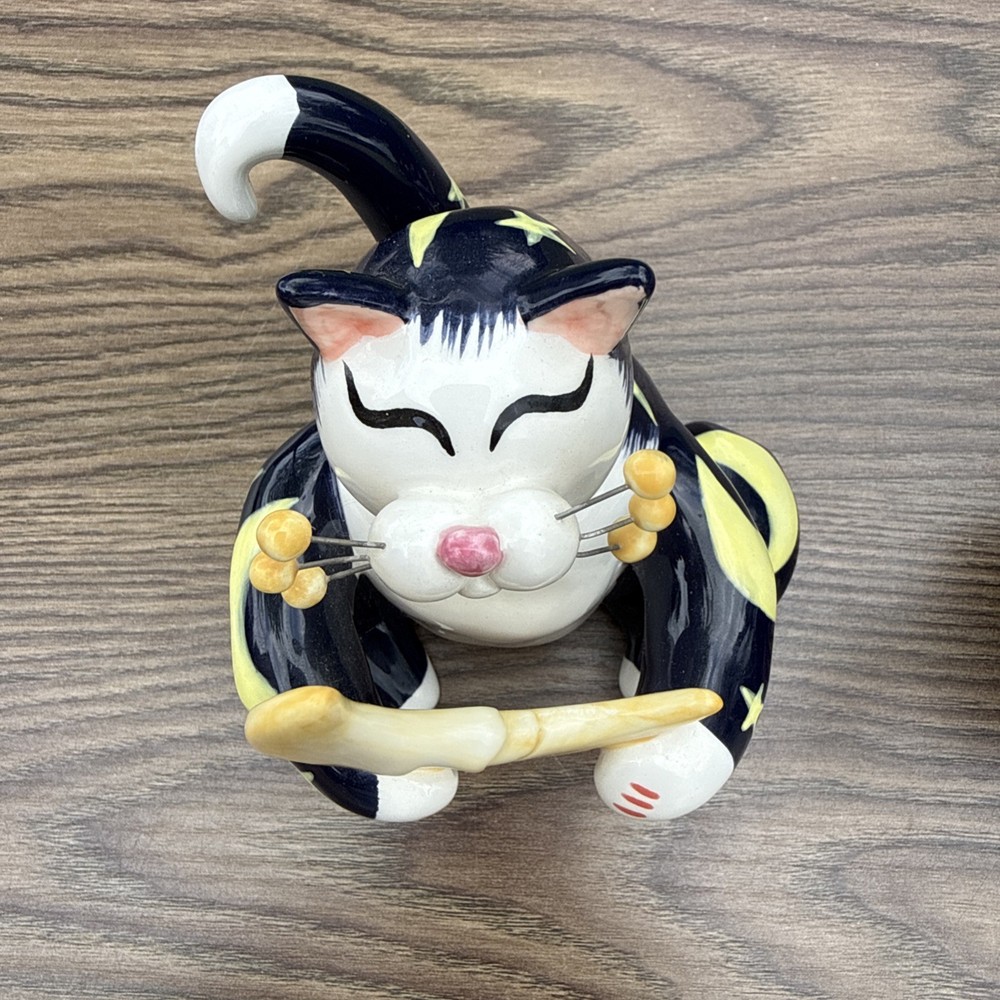 The Amy Lacombe WhimsiClay Cats Figurines #21045 #24807 and unnubered are charming collectible figurines of cats made of clay. Designed by Amy Lacombe, these whimsical figurines feature cats with a moon and floral dot design, adding a playful touch to any cat lover's collection. Made in China, these figurines capture the essence of the brand's playful and unique style, making them a delightful addition to any cat-themed decor.
