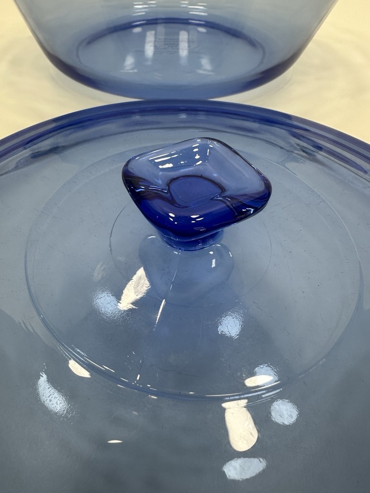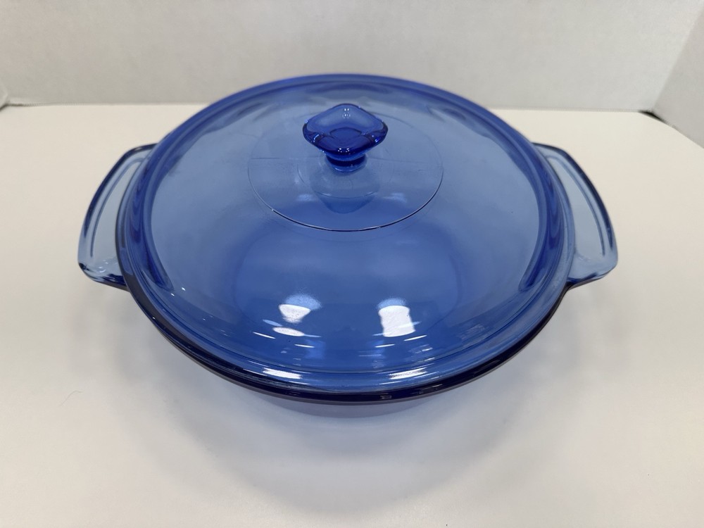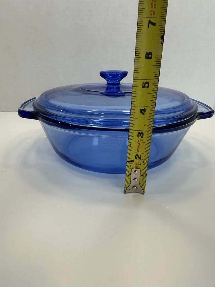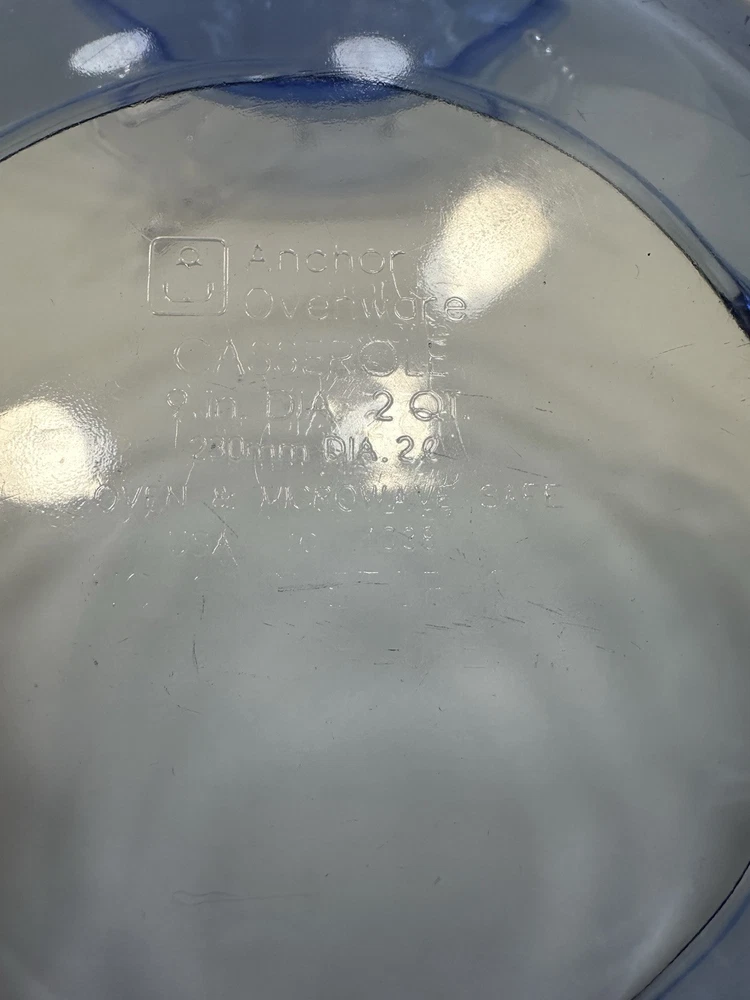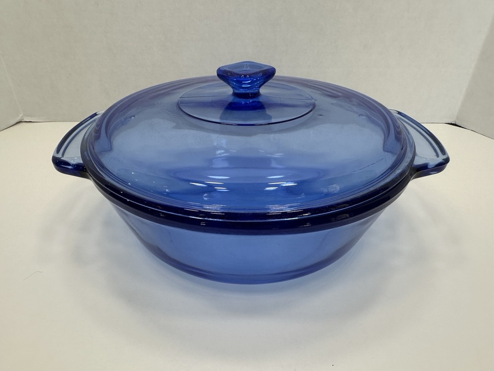 There is a chip or small flat piece that looks like a chip on the rim of the dish. Please see photos. Otherwise it is in good condition. The image shows a vintage Anchor Hocking cobalt blue glass casserole dish with a lid, likely from the mid-20th century. Here are some details: Brand: Anchor Hocking, known for durable and heat-resistant glassware. Material: Cobalt blue glass, oven and microwave-safe. Capacity: 2 quarts. Dimensions: Approximately 9 inches in diameter and 4.75 inches tall with the lid. Care: Dishwasher safe, avoid sudden temperature changes. Usage: Suitable for baking and serving casseroles or other dishes in a preheated oven up to 425°F (200°C). Condition: Vintage items may show minor wear, such as scratches