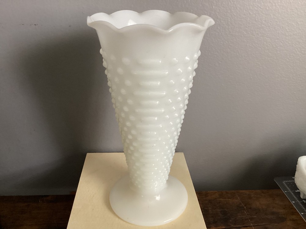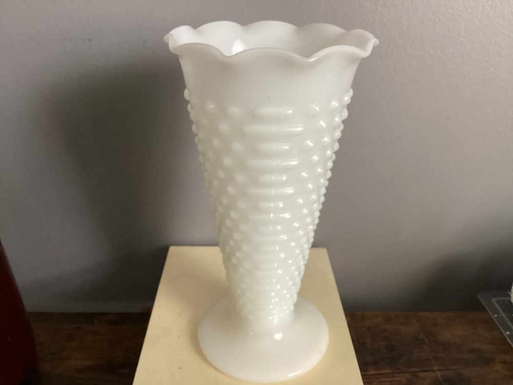 The Anchor Hocking Milk Glass Trumpet Vase is a charming piece with a scalloped rim and dot dash design, perfect for all occasions. Made of white glass and measuring 9 inches in height, this mid 20th-century collectible exudes a 1960s style. Crafted in the United States by Anchor Hocking, this original piece is a beautiful addition to any collection of decorative items. NO CHIPS OR CRACKERS