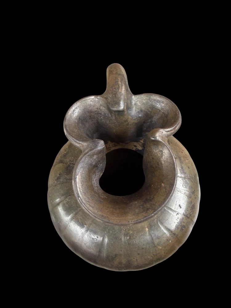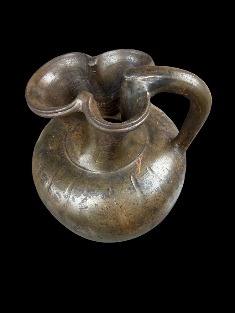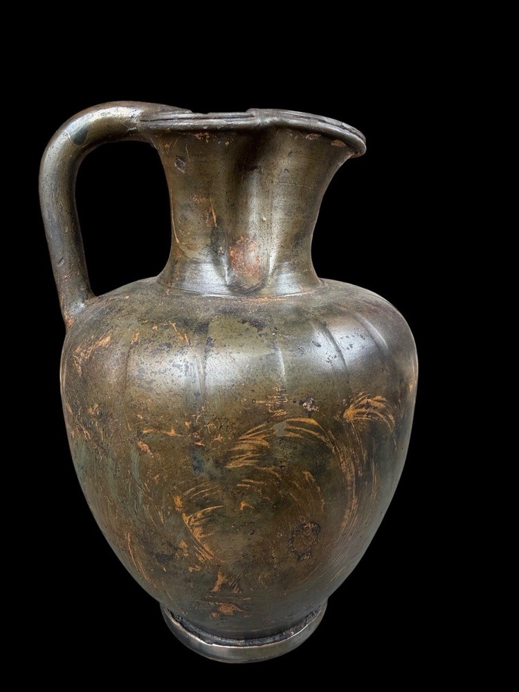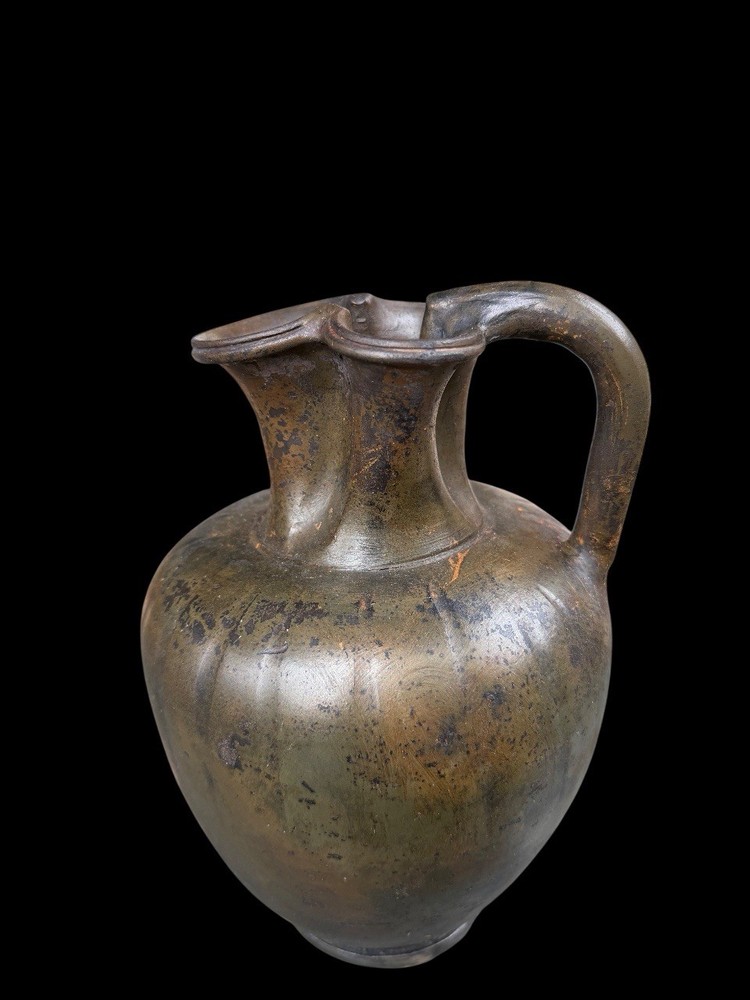 A GREEK BLACK-GLAZED TREFOIL OINOCHOE SOUTH ITALIAN, CIRCA LATE 4TH CENTURY B.C. The broad ovoid body dipping slightly at the shoulders toward the concave neck, a raised fillet at the join, the plain handle tapering toward the body, a reserved band above the foot Measures 25 cm x 16 cm Private ex collection Francé years 80
