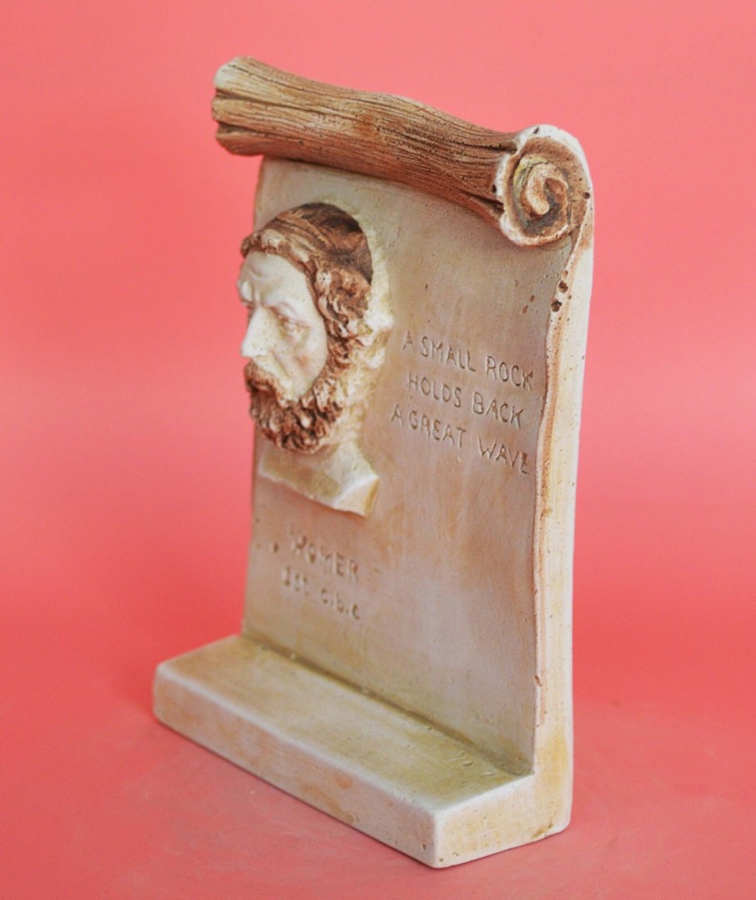 HOMER RELIEF WITH QUOTE Homer (c. 750 BCE) is the legendary author of the Iliad and the Odyssey, two epic poems that are the central works of ancient Greek literature. Homer is the greatest of all epic poets and his legendary status was well established by the time of Classical Athens. Homer is the earliest poet in Western culture whose works have survived intact. Legend has it that he was blind and recited his poems as he traveled from one place to another. For this reason, people say that he called himself a singer, as opposed to a writer. It is said that after his death on the island of Ios, others kept his work alive by reciting them wherever they traveled and eventually scribes wrote them down. Homer created fabulous poetry expressing deep human emotions. The Greeks put him on a very high pedestal proclaiming him their greatest poet and almost worship him. Please be aware that, due to the fact that our products are either individually cast, carved, hand painted and hand finished, there will inevitably be minor variations in size, colour and texture.(B83) Details: Condition: New, Handmade in Greece Material: Casting stone Height: 13 cm(5.1 inches) Width : 9 cm(3.5 inches) Weight : 260 g