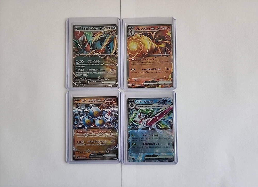 U.S. Seller!!! Bundle Lot of 8 EX, SR, & AR Pokémon cards from the New Japanese set Ancient Roar. All cards were freshly pulled from packs, and each one was immediately put into a sleeve and top loader. All cards shown in the photos are the exact cards that you will receive. The cards are: Sandy Shocks ex, Roaring Moon ex, Tsareena ex, Armarouge ex, Tsareena ex SR, Veluza AR, Garganacl AR, and Slither Wing AR. The cards will be packaged with cardboard around the cards, bubble wrapped, and placed inside a bubble mailer. Please see photos for details and condition.