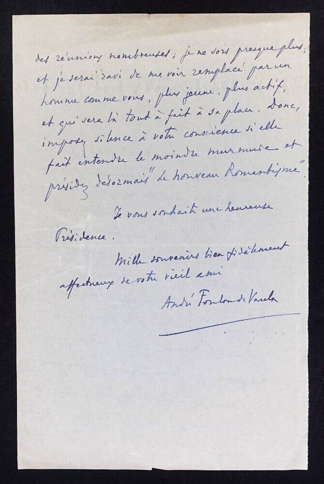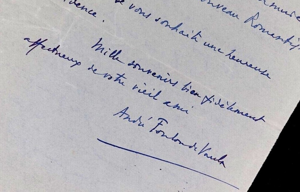 Lettre autographe signée de André FOULON DE VAULX sur papier à en-tête de l' hôtel l'Univers de Tours. État : Bon état, noter toutefois des déchirures sur les bords du document . Voir photos pour plus de détails. Dimensions : 13,5 x 21 cm. 2 pages. André Foulon de Vaulx, né le 15 mai 1873 à Noyon et mort à Paris le 18 décembre 1951, est un poète et romancier français. Fils de l'industriel et historien d'origine belge, Henri Foulon de Vaulx, il fut président de la Société des poètes français et ami et correspondant de Jeanne Sandelion entre 1938 et 1948. Wikipédia Envoi soigné dans un emballage rigide et étanche. Satisfait ou remboursé. Si vous n'êtes pas entièrement satisfait, je reprends la marchandise avec retour à ma charge pour l'Europe et à la charge de l'acheteur pour le reste du monde. N’hésitez pas à visiter ma boutique et affiner vos recherches en fonction des catégories qui vous intéressent. Ma boutique L'Art Délivré. Lettres autographes, vieux papiers, livres anciens, photographies, gravures, timbres… Nous expertisons et/ou rachetons dans toute la France vos lettres, collections de lettres et livres anciens. Merci de votre visite. Jérôme KAYSER. État : Bon état, noter toutefois des déchirures sur les bords du document. Voir photos pour plus de détails. André Foulon de Vaulx, né le 15 mai 1873 à Noyon et mort à Paris le 18 décembre 1951, est un poète et romancier français. Fils de l'industriel et historien d'origine belge, Henri Foulon de Vaulx, il fut président de la Société des poètes français et ami et correspondant de Jeanne Sandelion entre 1938 et 1948. Wikipédia Satisfait ou remboursé. Si vous n'êtes pas entièrement satisfait, je reprends la marchandise avec retour à ma charge pour l'Europe et à la charge de l'acheteur pour le reste du monde. N’hésitez pas à visiter ma boutique et affiner vos recherches en fonction des catégories qui vous intéressent. Ma boutique Nous expertisons et/ou rachetons dans toute la France vos lettr
