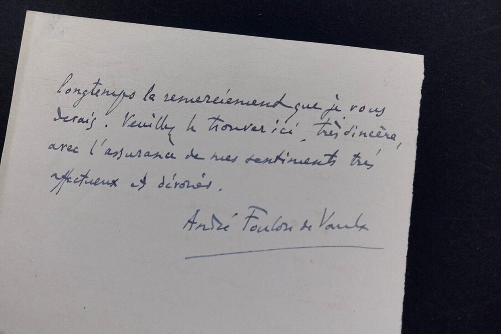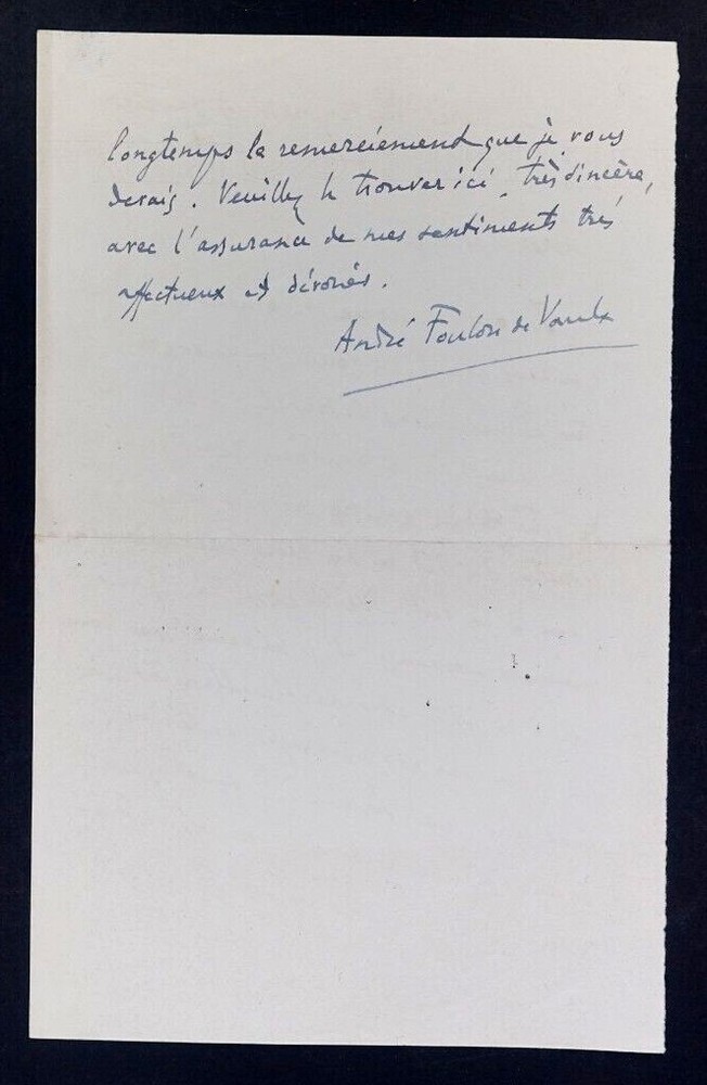 Lettre autographe signée de André FOULON DE VAULX . État : Très bon état . Voir photos pour plus de détails. Dimensions : 13,3 x 21 cm. 2 pages. André Foulon de Vaulx, né le 15 mai 1873 à Noyon et mort à Paris le 18 décembre 1951, est un poète et romancier français. Fils de l'industriel et historien d'origine belge, Henri Foulon de Vaulx, il fut président de la Société des poètes français et ami et correspondant de Jeanne Sandelion entre 1938 et 1948. Wikipédia Envoi soigné dans un emballage rigide et étanche. Satisfait ou remboursé. Si vous n'êtes pas entièrement satisfait, je reprends la marchandise avec retour à ma charge pour l'Europe et à la charge de l'acheteur pour le reste du monde. N’hésitez pas à visiter ma boutique et affiner vos recherches en fonction des catégories qui vous intéressent. Ma boutique L'Art Délivré. Lettres autographes, vieux papiers, livres anciens, photographies, gravures, timbres… Nous expertisons et/ou rachetons dans toute la France vos lettres, collections de lettres et livres anciens. Merci de votre visite. Jérôme KAYSER. André Foulon de Vaulx, né le 15 mai 1873 à Noyon et mort à Paris le 18 décembre 1951, est un poète et romancier français. Fils de l'industriel et historien d'origine belge, Henri Foulon de Vaulx, il fut président de la Société des poètes français et ami et correspondant de Jeanne Sandelion entre 1938 et 1948. Wikipédia Satisfait ou remboursé. Si vous n'êtes pas entièrement satisfait, je reprends la marchandise avec retour à ma charge pour l'Europe et à la charge de l'acheteur pour le reste du monde. N’hésitez pas à visiter ma boutique et affiner vos recherches en fonction des catégories qui vous intéressent. Ma boutique Lettres autographes, vieux papiers, livres anciens, photographies, gravures, timbres… Nous expertisons et/ou rachetons dans toute la France vos lettres, collections de lett