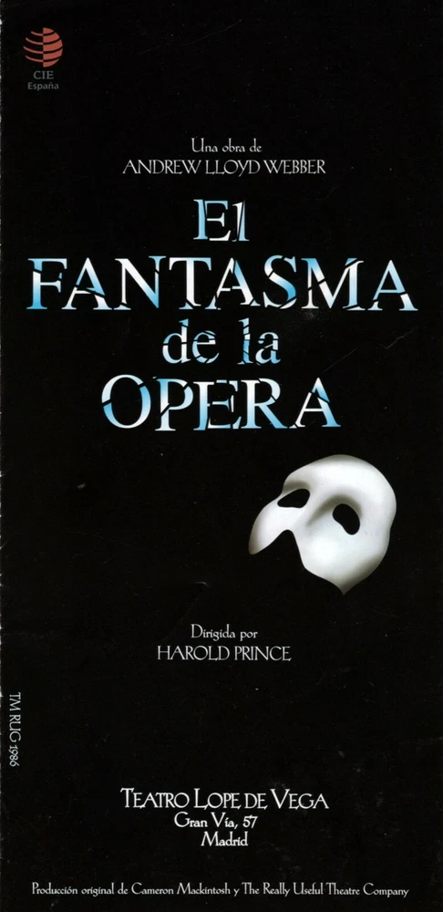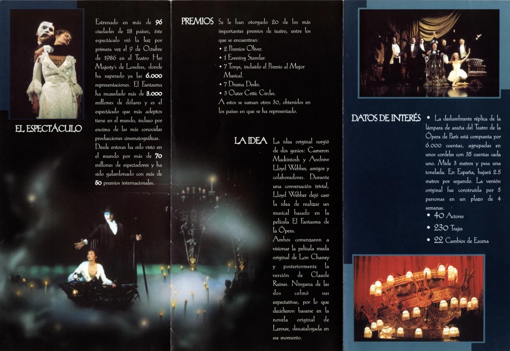 This is a rare six panel advertising herald (flyer) promoting the Original Spanish production of the landmark ANDREW LLOYD WEBBER musical "EL FANTASMA DE LA OPERA" ("The Phantom of the Opera") at Teatro Lope de Vega in Madrid, Spain. (The production opened September 4th, 2002 and ran for more than 21 months, closing June 21st, 2004.) ..... The production starred JUAN CARLOS BARONA in the title role, JULIA MOLLER as "Christine Daae" and ZENON RECALDE as "Raoul" ..... Side note: On January 9th, 2006, The Phantom of the Opera became the longest-running musical in Broadway history, surpassing the previous record held by Cats . The Phantom of the Opera was the winner of seven 1988 Tony Awards including "Best Musical" ..... BROADWAY CREDITS: Music by ANDREW LLOYD WEBBER ("Jesus Christ Superstar", "Evita", "Cats", "Joseph and the Amazing Technicolor Dreamcoat", "Song and Dance", "Starlight Express", "The Phantom of the Opera", "Aspects of Love", "By Jeeves", "Sunset Boulevard"); Book by ANDREW LLOYD WEBBER and RICHARD STILGOE based on the novel by GASTON LEROUX; Lyrics by CHARLES HART; Additional Lyrics by RICHARD STILGOE; Sets and Costumes designed by MARIA BJORNSON; Choreographed by GILLIAN LYNNE; Directed by HAROLD PRINCE; Produced by CAMERON MACKINTOSH and THE REALLY USEFUL THEATRE COMPANY ..... DETAILS: Advertising handbills and heralds were often distributed or inserted into the playbills of other productions to help generate ticket sales for upcoming shows and events. The six panel, bi-fold flyer measures 4 1/4" X 8 3/4" inches (approx. 12 1/2" X 8 3/4" inches when opened) and includes wonderful graphics, five full color production photos, promotional text (most text in Spanish), ticket prices, theater seating plan and booking information ..... CONDITION: With the exception of light edge wear, this flyer is in excellent condition and will make a wonderful addition to the collection of any musical theatre aficionado or historian. This item will be carefully packaged in a protective, carded sleeve and backed by stiff cardboard.