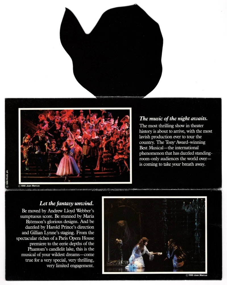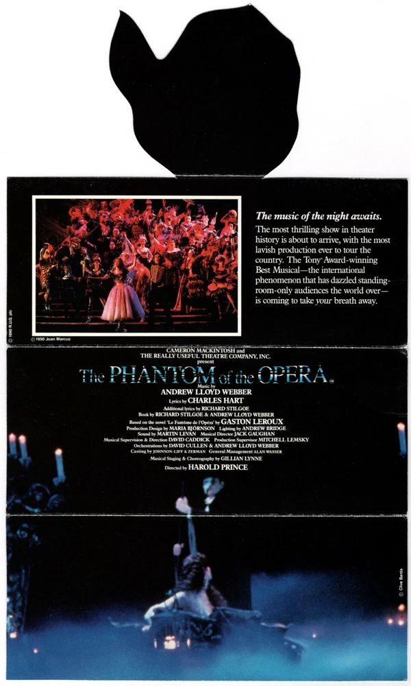 This is a rare die-cut advertising herald (flyer) promoting group sales for the Philadelphia Premiere engagement of the landmark ANDREW LLOYD WEBBER musical "THE PHANTOM OF THE OPERA" at the Forrest Theatre in Philadelphia, Pennsylvania beginning February 10th, 1992. ( The Original Broadway production opened January 26th, 1988 at New York's Majestic Theatre and has announced a February 18th, 2023 closing after 13,765 performances. It is, by over 3,500 performances, the longest-running show in Broadway history . This tour opened May 22nd, 1990 at the Auditorium Theatre in Chicago and ran for more than eight years, closing November 15th, 1998 at the Pantages Theatre in Los Angeles . ) ..... The musical starred KEVIN GRAY in the title role, TERI BIBB as "Christine Daae" and KEITH BUTERBAUGH as "Raoul" and featured RICK HILSABECK, DAVID HUNERYAGER, PATRICIA HURD, OLGA TALYN, DONN COOK and PATRICIA WARD with SARAH PFISTERER playing the role of "Christine Daae" at certain performances ..... Side Note: On January 9th, 2006, The Phantom of the Opera became the longest-running musical in Broadway history, surpassing the previous record held by Cats . The Phantom of the Opera was honored with seven 1988 Tony Awards including "Best Musical" ..... CREDITS: Music by ANDREW LLOYD WEBBER ("Jesus Christ Superstar", "Evita", "Cats", "Joseph and the Amazing Technicolor Dreamcoat", "Song and Dance", "Starlight Express", "The Phantom of the Opera", "Aspects of Love", "Jeeves", "Sunset Boulevard", "School of Rock"); Book by ANDREW LLOYD WEBBER and RICHARD STILGOE based on the novel by GASTON LEROUX; Lyrics by CHARLES HART; Additional Lyrics by RICHARD STILGOE; Sets and Costumes designed by MARIA BJORNSON; Choreographed by GILLIAN LYNNE; Directed by HAROLD PRINCE; Produced by CAMERON MACKINTOSH and THE REALLY USEFUL THEATRE COMPANY ..... DETAILS: This rare die-cut, eight panel flyer measures approx. 9 1/8" X 3 7/8" inches (9 1/8" X 15 1/4" inches when opened), is printed on a glossy card stock and includes wonderful graphics, full color photography, promotional text, production credits and booking information ..... CONDITION: With the exception of moderate edge wear, this rare flyer is in excellent condition and will make a wonderful addition to the collection of any musical theatre aficionado or historian. This item will be carefully packaged in a protective, carded sleeve and backed by stiff cardboard.