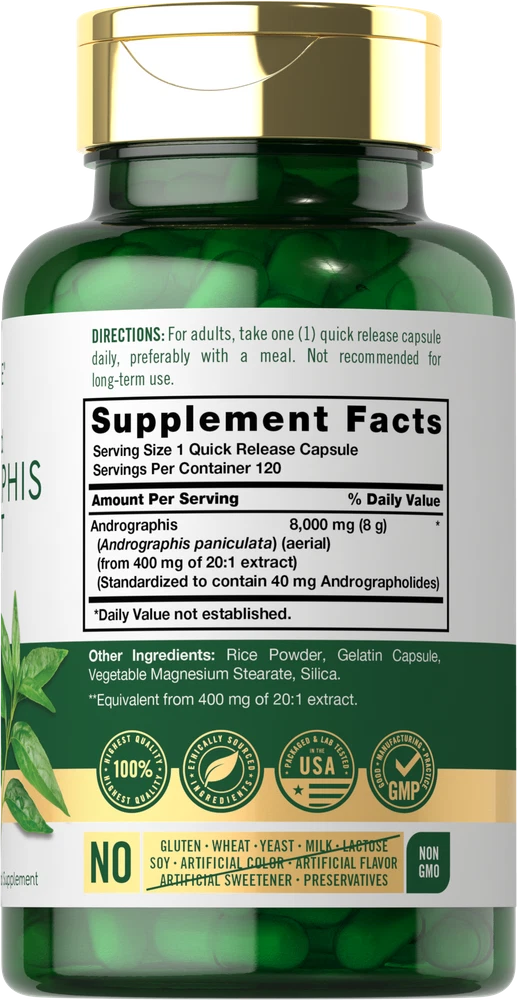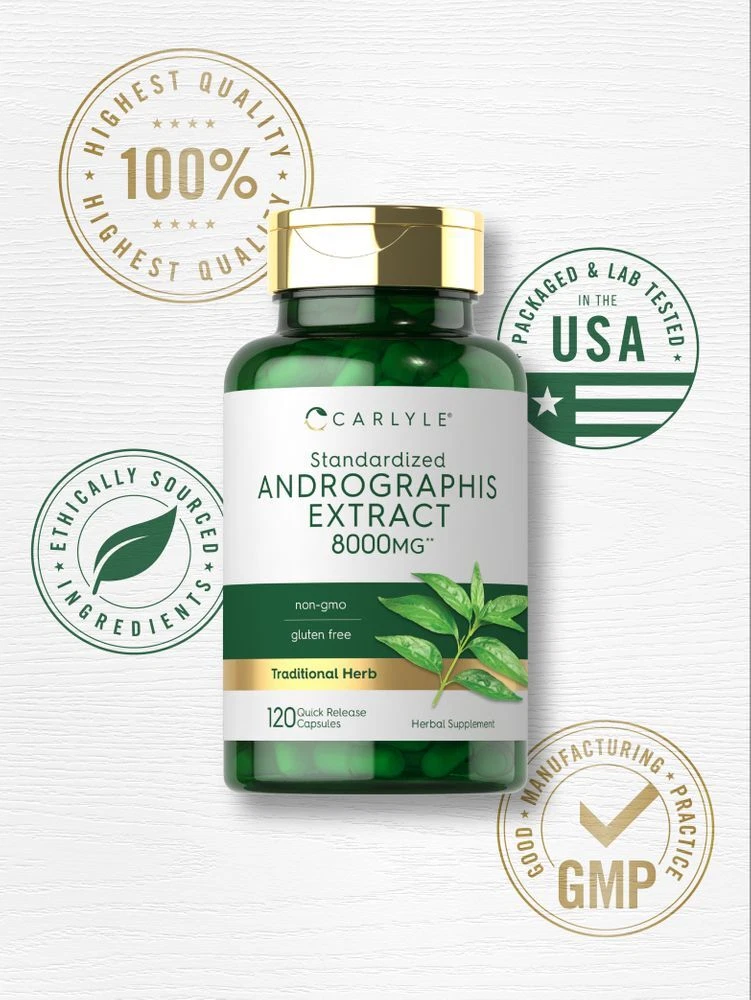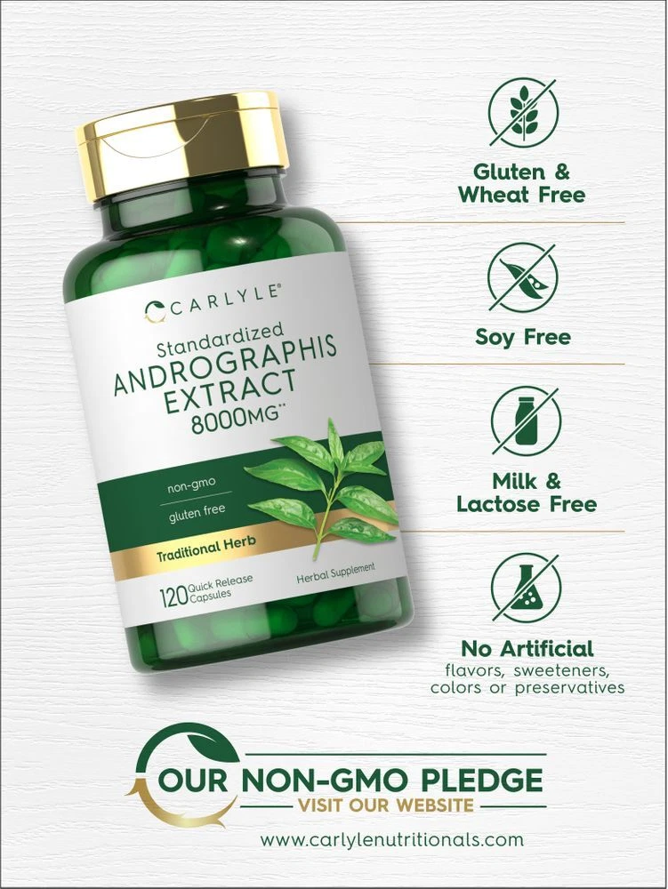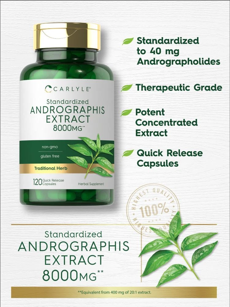 What is Andrographis? Andrographis paniculata is a tall slender herb found in various regions of South Asia, where it has long been valued in Ayurvedic wellness practices for men and women. The leaves, stems, and roots of this plant are a potent source of botanical compounds known as Andrographolides and are now commonly received from an herbal supplement like pills, capsules, gummies, chewable tablets, liquid drops, tea, bulk powder, tincture, and other complex formulas. Carlyle Andrographis: At Carlyle, we take the extra step to ensure exceptional purity and potency that matches our elite quality standard. Our Andrographis full spectrum formula is standardized to contain 40 mg of Andrographolides, delivering the equivalent of an 8,000 mg aerial extract in just one capsule! It’s gluten free and non-GMO, made with no preservatives, making it an excellent addition to any lifestlye routine. Rooted in Wellness: Our expertise in sourcing the purest ingredients combined with advanced technologies makes us proud to deliver premium, honest supplements at a great value. Carlyle Andrographis is a testament to our commitment to excellence, made with powerful ingredients rooted in wellness. Thanks for choosing us in your pursuit of living health. **Equivalent from 400 mg of 20:1 extract