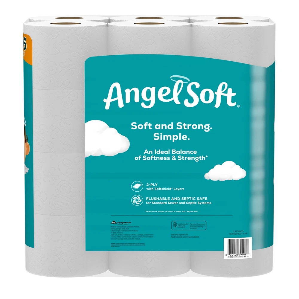 Product details Here’s something to harp on—Angel Soft Mega Rolls last and last with rolls that are 4 times as big as our Regular Rolls. With 320 2-ply sheets on every Mega Roll, you’ll always have plenty of the softness and strength you love on hand. Plus, each generously sized bathroom tissue roll still fits harmoniously in most standard toilet paper holders. And like all your favorite Angel Soft products, each of our 24 Mega Rolls are flushable and septic safe in well-maintained sewer and septic systems. Angel Soft Toilet Paper. Soft and strong. Simple. Every roll of Angel Soft Toilet Paper delivers a heavenly combination of softness and strength you can count on every time Each Mega Roll is equal to 4 Angel Soft Regular Rolls, so you can change the roll less often Mega Rolls deliver the long-lasting toilet paper rolls you need at a price you’ll love. How divine! Angel Soft Bath Tissue is septic safe in well-maintained sewer and septic systems and made from SFI sustainably sourced trees Each bulk toilet paper pack contains 24 Mega Rolls with 320 2 ply toilet paper sheets per roll