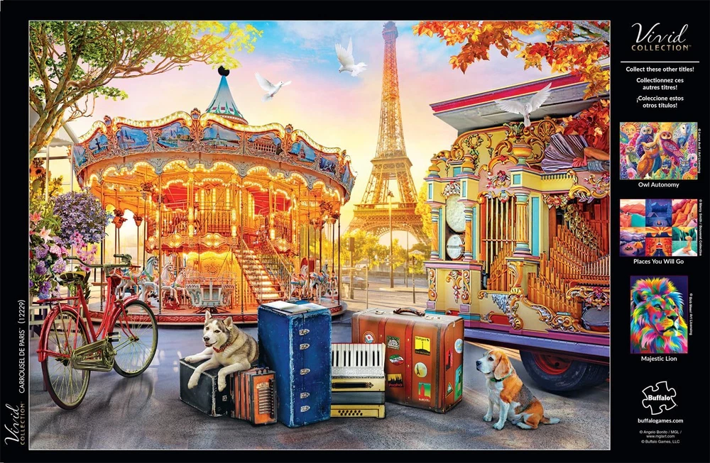 Carrousel de Paris is a 1000-piece jigsaw puzzle from the Vivid Collection by . At the steps of the Eifel Tower enjoy a ride under the twinkling lights of the carrousel. Let the pups watch your luggage as you venture off to enjoy the sights and sounds of Paris. The Vivid Collection includes a variety of bright images from an array of artists and photographers from around the globe. Every jigsaw puzzle is manufactured from recycled puzzle board. A precision cutting technique guarantees that every piece will fit soundly with the company's signature Perfect Snap™. A bonus puzzle poster is also included so that you have a handy reference of what the completed puzzle should look like while you put yours together. 1000 PIECE JIGSAW PUZZLE – This 1000-piece jigsaw puzzle is the perfect level of challenge. Measuring 7.94in. x 7.94in., this puzzle is a great single evening activity for the entire family, friend group or yourself. For adults ages 14 and up. HIGHEST QUALITY MATERIALS – The puzzle pieces are thick and sturdy. Our high-quality dies cut our puzzles with laser precision. APEX PUZZLE IMAGERY - Relax and enjoy the puzzling process while “traveling” to some of the most beautiful, bucket-list places, Or join in the fun with our portfolio of licensees, or finish in style with world renown artists. FULL COLOR BONUS POSTER - Every puzzle includes a full color poster to reference while assembling your puzzle. Or, for a real challenge, try to solve without the poster in hand! PERFECT GIFT - Puzzles are not only great gifts for any and all occasions including birthdays, holidays, housewarming parties or even just a fun night in with friends.