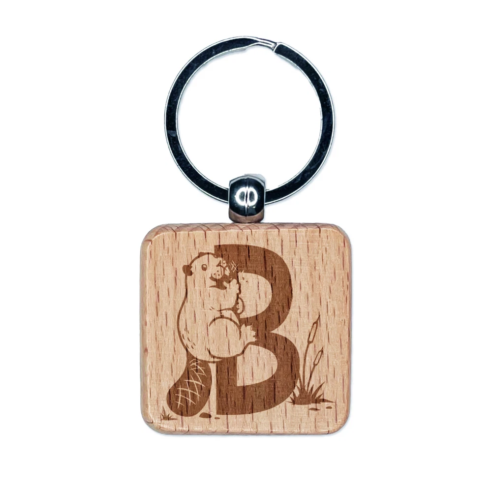 Animal Alphabet Letter B for Beaver Engraved Wood Square Keychain Tag Charm