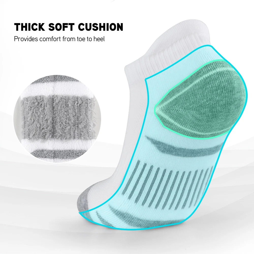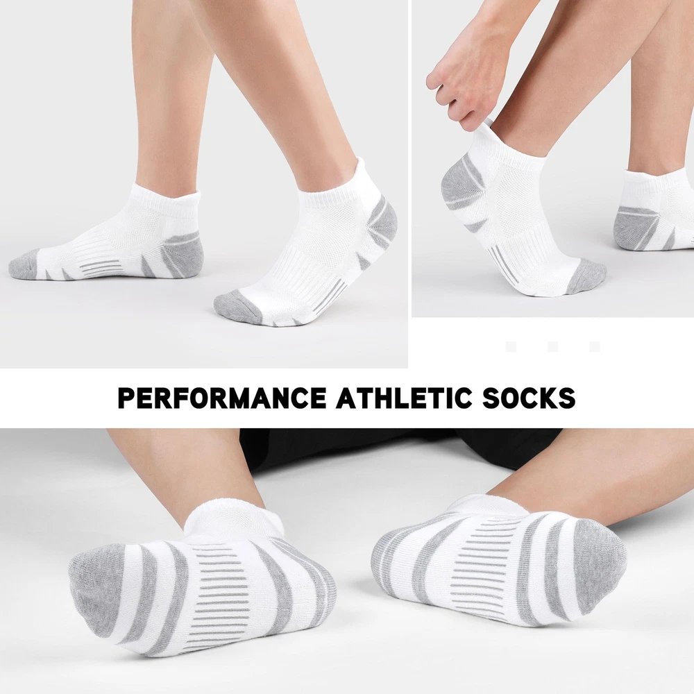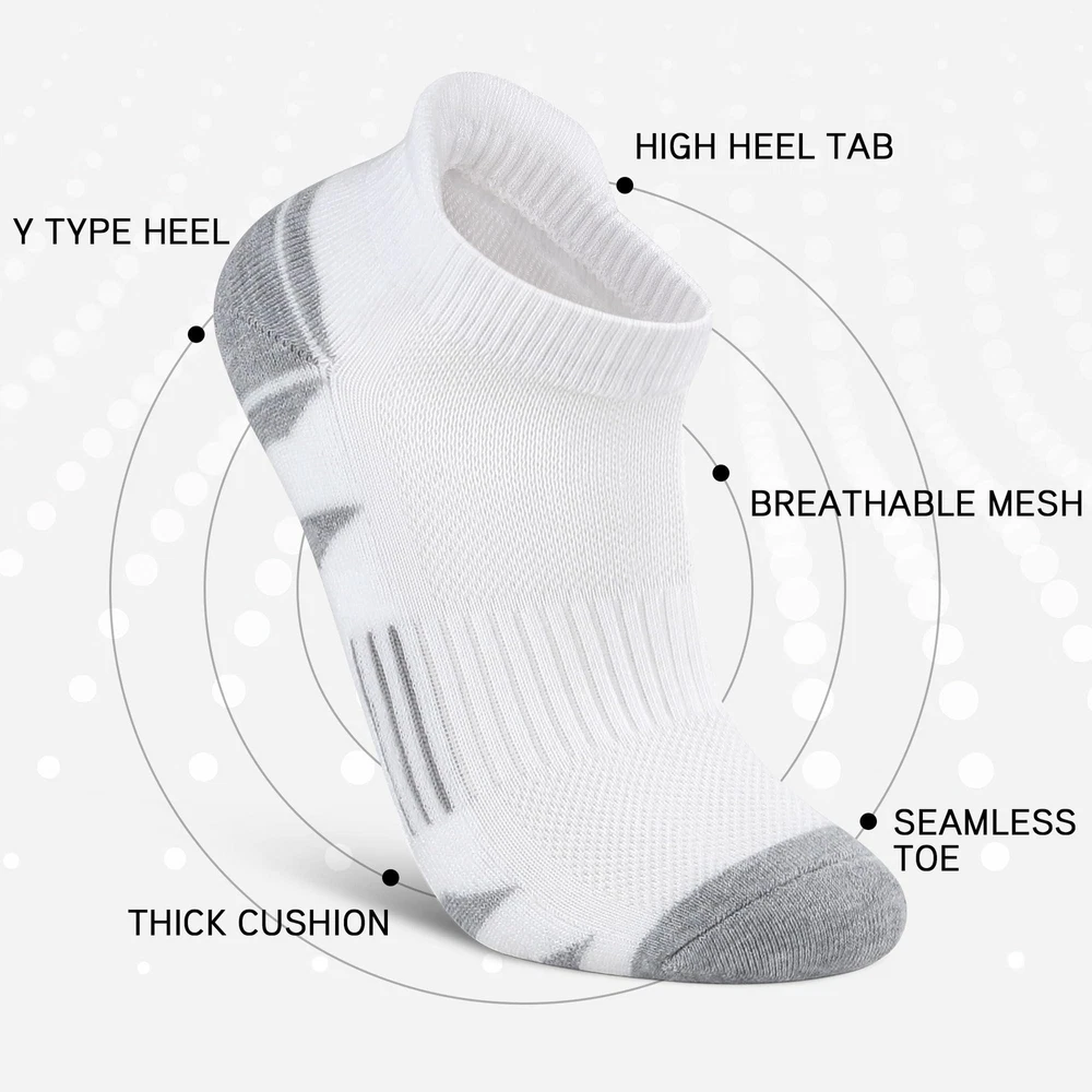 【Breathable & Soft】The upper mesh part of the athletic socks adopt advanced weaving technology, sweat-absorbent and breathable, release the heat and keep your feet dry and cool. The men's ankle socks are in great stretch and high quality, providing a great help to relax your feet. 【Comfortable & Cushioned】Our athletic cushioned socks adopt a seamless toe design, from toe to heel are padded with thick yarn to reduce the impact of friction and prevent foaming when moving. Full thick cushion padding in low cut ankle socks can reduce impact for a great comfort. 【No Slipping Off & Support】The elastic band holds the men ankle socks tightly around your ankle, keep the socks in position of your shoes. And proper compression in arch fits the individual shape of your foot, increase stability for a perfect fit when you exercise. Perfect sport socks for your running shoes, tennis shoes, or other sports shoes. 【Men Women Ankle Socks】ankle socks are designed for daily comfort wear, featuring a soft and cozy texture that makes them perfect for exercise. Low cut design could almost be hidden inside many shoes. Ideal performance socks for hiking, walking, running, camping, mountaineering, traveling. 【3 Sizes to Choose】We offer low cut ankle socks a choice of 3 sizes from M to XL in Black White Gray, meet the demands of you as well as your family and your friends.