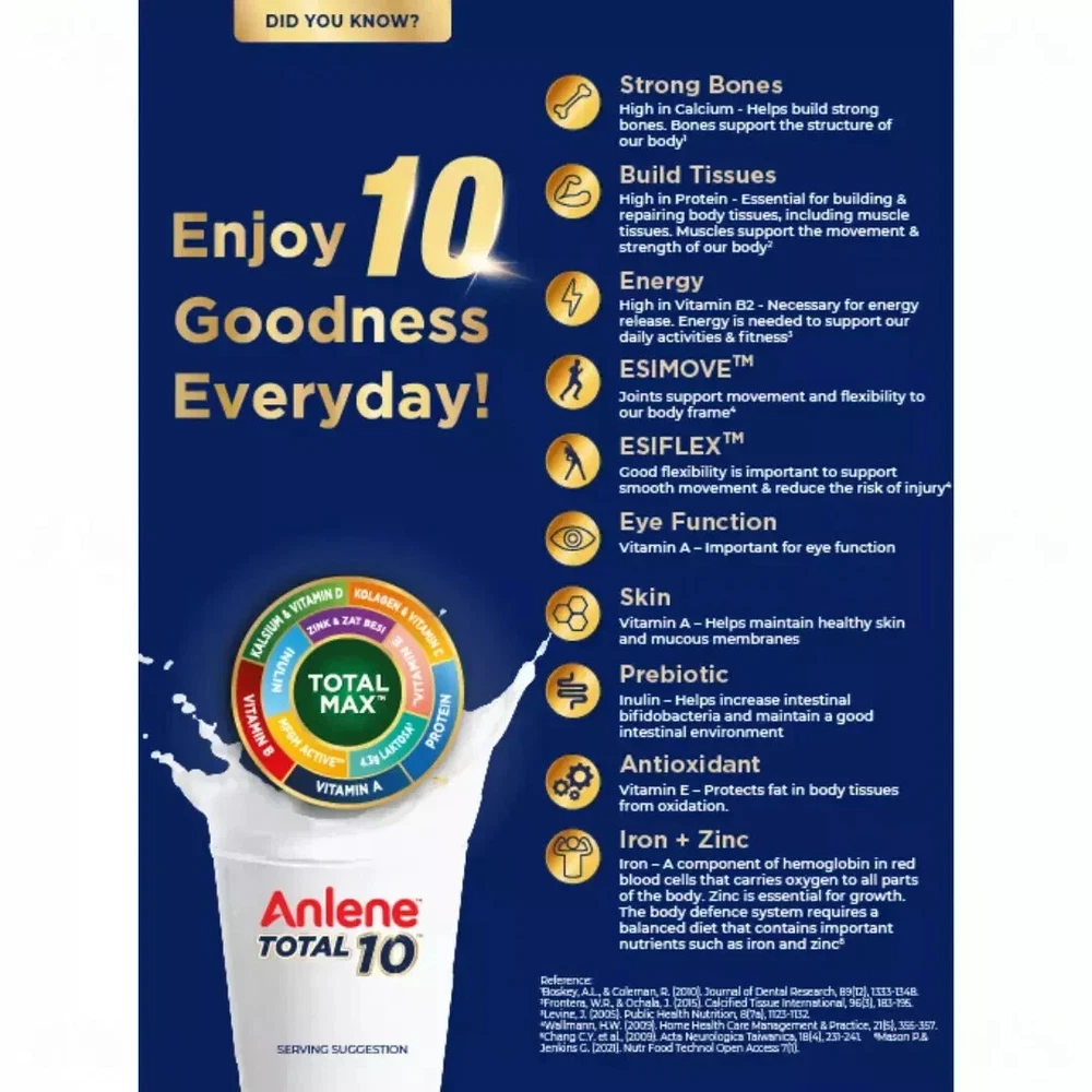 1 X Anlene Total 10 High Calcium & Collagen Adult Milk Powder 800g Ensuring our diet is always balanced may be difficult and as we age, our body becomes less efficient in absorbing some nutrients. Hence, it's crucial to make smart choices when it comes to food selection. Get the important nutrients every day to help maintain an active and meaningful lifestyle, even as we age. Anlene Total 10 is scientifically formulated with 28 beneficial nutrients & ingredients, including high calcium, high protein, MFGM Active, Collagen, Prebiotic, and lower lactose. Enjoy the 10 goodness every day. Support your overall wellness with balanced diet and active lifestyle today! Compared to regular milk. Anlene Total 10 only contains 4.3g lactose in each 200ml serving. Regular milk contains 8.6g lactose per 200ml serving. New Zealand Food Composition Database Reference. Direction for Use: Add 5 tablespoons (55g) of milk powder to 1 glass (200ml) of warm water and stir. Drink 2 glasses in a day. Ingredients: Maltodextrin, Cow's Milk Solids (Whole Milk Powder, Milk Protein Concentrate, Whey Protein Isolate & Buttermilk Powder^), Inulin, Minerals (Calcium Carbonate, Potassium Citrate, Magnesium phosphate, Potassium Chloride, Ferric Pyrophosphate, Magnesium Oxide, Zinc Oxide, Copper Sulphate, Manganese Sulfate, Sodium Molybdate, Sodium Selenite, Potassium Iodide, Chromium Chloride), Creamer Powder (Plant), Soy Protein Powder, Vitamins (Choline Bitatrate, Sodium ascorbate, Vitamin E acetate, Niacinamide, Biotin, Vitamin D3, Vitamin A acetate, Pyridoxine hydrochloride, Calcium pantothenate, Thiamine Mononitrate, Riboflavin, Vitamin B12, Folic acid, Vitamin K), Flavourings, Fish Collagen (0.2%), Emulsifier (INS 322, Soy lecithin). ^Source for Milk Fat Globule Membrane (MFGM). Phospholipid is a main component in MFGM PAYMENT We only accept payment via PayPal/Google Pay/VISA/Master Card. SHIPPING Please make sure you have read and understand all shipping information before you bid our items: · Please make sure your postal address is correct! · All item will be shipped within 4 business days , after receiving the full payment. The items shipped from Malaysia using Standard international postage and it normally take within 10-14 working days to deliver. · Express Shipping from Aboard with Full Tracking. Normally it takes 5-10 working days for delivery on all international order. If your item does not arrive within the time frame, please contact us via eBay message. · Standard Shipping from Abroad with Full Tracking. Normally it takes 10-14 working days for delivery on all international order. If your item does not arrive within the time frame, please contact us via eBay message. · Proof of shipment will be kept for future reference. · Your item will be packed up properly to avoid any damages. · To ensure a smooth delivery/transaction, please make sure your shipping address is verified and correct (which is associated with your PayPal account). We are not responsible for invalid addresses. Worldwide shipping available. CUSTOMS · Not responsible for your country’s customs. Please check with your country’s customs before you buy. · All the customs fee & taxes will be on the buyer’s responsibility. · Also allow some time for your country’s customs clearance time, because the delays usually come from Customs. · Seller are not responsible for item lost, but seller always keeps the proof of delivery. FEEDBACK We are always working hard for maintain high standards ***** of excellence and strive for 100% customer satisfaction. So your positive feedback is very important. If you have any problem with items received such as not as described or damaged, please message us. For any cases that you consider about the neutral and negative feedback, please contact our customer services executive for assistance. We will resolve your concern at your earliest convenience . We greatly appreciate your POSITIVE feedback . Please do NOT leave negative feedback without asking for help. Welcome you back to our store again.
