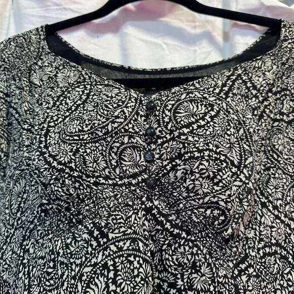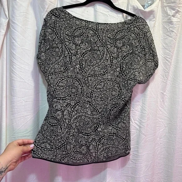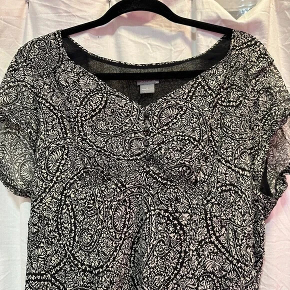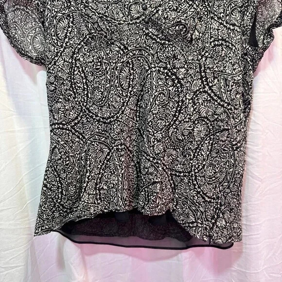 This elegant Ann Taylor blouse features a classic black and white color scheme with a fitted silhouette. The blouse is designed with a sophisticated style, perfect for both professional and casual settings. Its refined look and comfortable fit make it a versatile addition to any wardrobe.