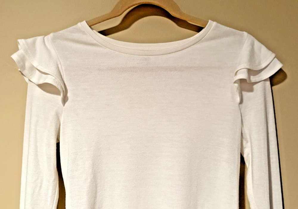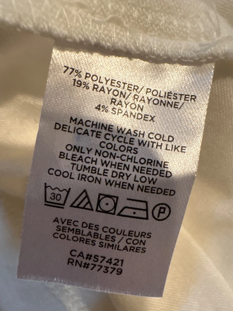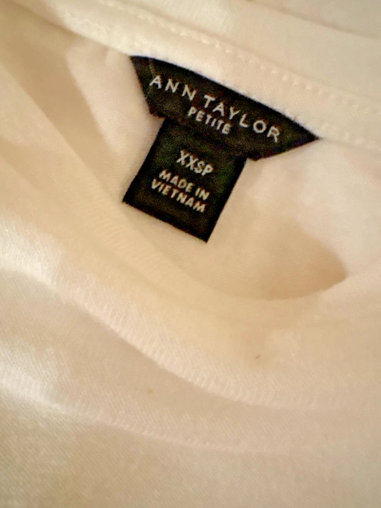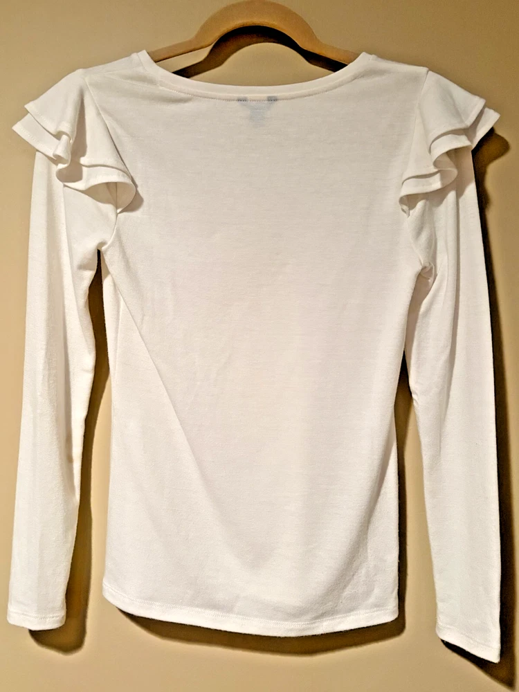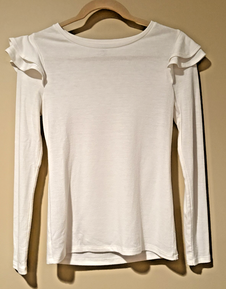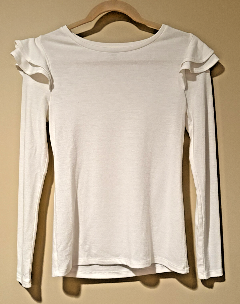 The Ann Taylor Women's Off White Ruffle Sleeve Top, in size XXS Petite, is a stylish choice for women looking for a comfortable top. Made from a blend of polyester, spandex, and rayon, this ivory top features long sleeves and ruffle accents. The solid pattern and petite size make it a versatile piece that can be dressed up or down for any occasion.