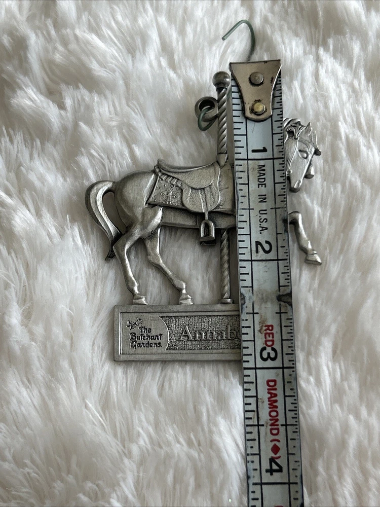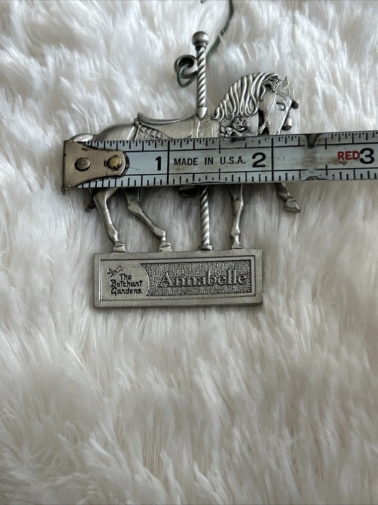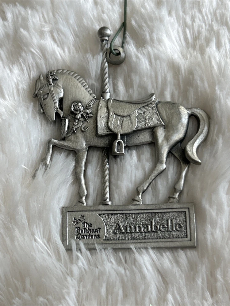 Add a touch of vintage charm to your holiday decor with this beautiful Annabelle metal ornament from The Burchart Garden Carousel collection. Crafted from high-quality metal, this small hanging decoration features a unique design that is perfect for Christmas. Whether you're an avid collector or just looking for a special holiday accessory, this ornament is sure to delight. With its metallic finish and intricate details, this Annabelle ornament is a must-have for any Christmas collection. The set includes one ornament and a hanging decoration, making it easy to display in your home or office. Celebrate the season with this elegant and timeless piece that will surely become a treasured part of your holiday tradition. Excellent condition