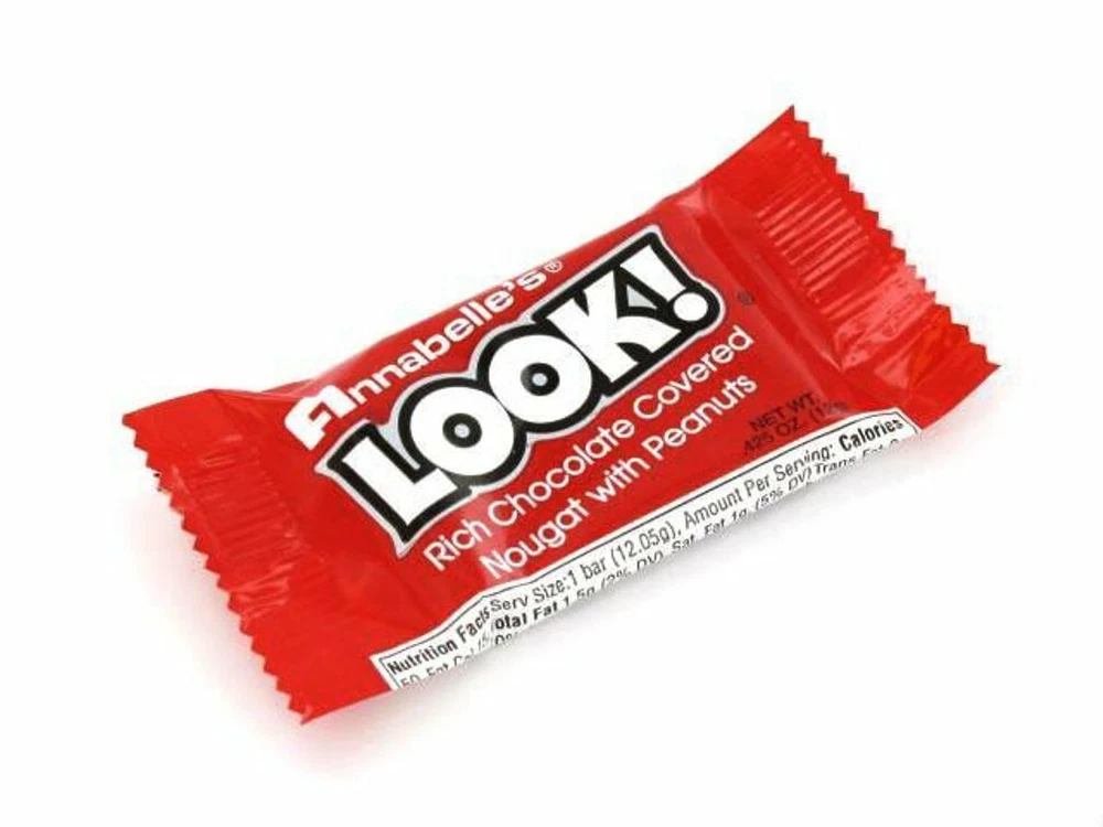 Annabelle's Look Bulk Candy By Weight Approx. 15 Pieces in 8 oz Look! Mini is an enticing chewy, peanut-filled nougat covered with mouth-watering, rich dark chocolate. This molasses covered bar filled with whole peanuts is a small version of the family favorite candy bar . Great candy that will be loved by kids of all ages (and adults too). Enjoy these sweet treats with many enticing flavors of the classic candy you crave. Individually wrapped. Items are repackaged in a facility that may contain milk, soy, peanuts, tree nuts, eggs, wheat and all other allergens.