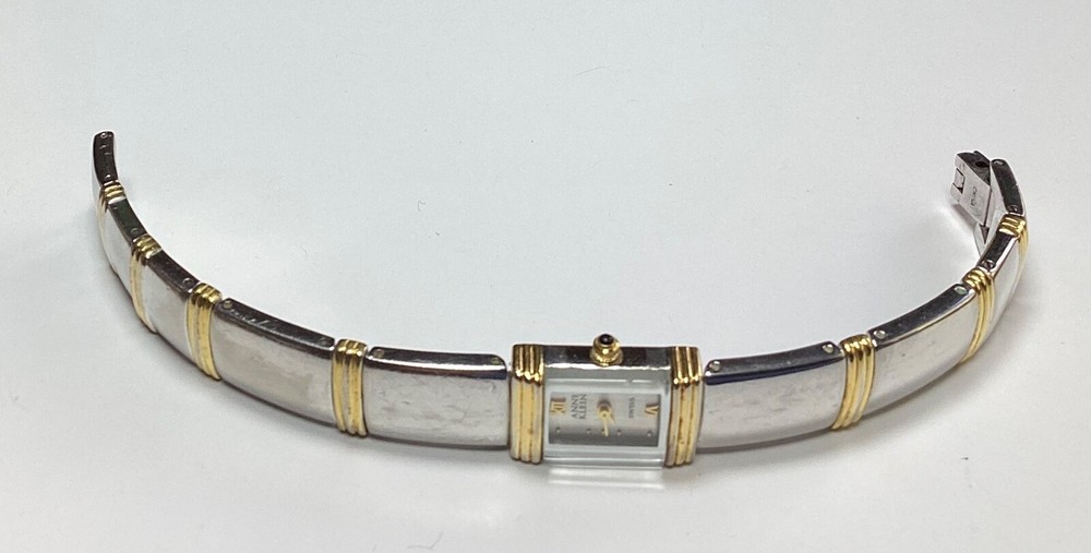 This beautiful Anne Klein wristwatch is a stunning addition to any outfit. With a quartz movement and a 12-hour dial, it is both functional and stylish. The bangle band is comfortable to wear and fits wrists between 5.76-6 inches (146.3-152.4 mm). The case is made of silver and gold, giving it a luxurious look. This wristwatch is perfect for formal occasions and comes with a snap caseback. It does not come with papers, an original box/packaging, or a manual/booklet. The seller does not provide a warranty or guarantee. It is a stunning piece that will make any outfit stand out. 1144