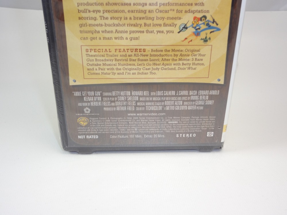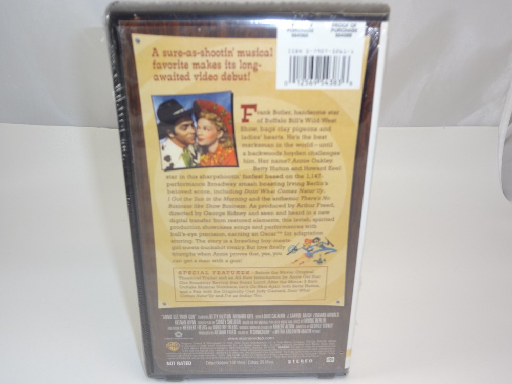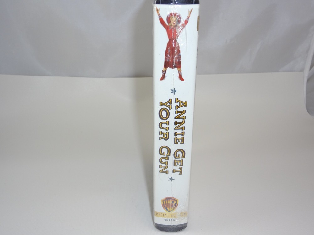 The product is a new sealed VHS tape of "Annie Get Your Gun" to commemorate its 50th anniversary. The clamshell packaging includes watermarks, adding a collectible element to the item. This edition is geared towards children and families, making it a nostalgic and family-friendly option for viewing classic musical films.