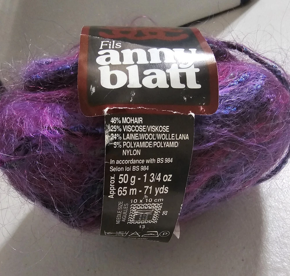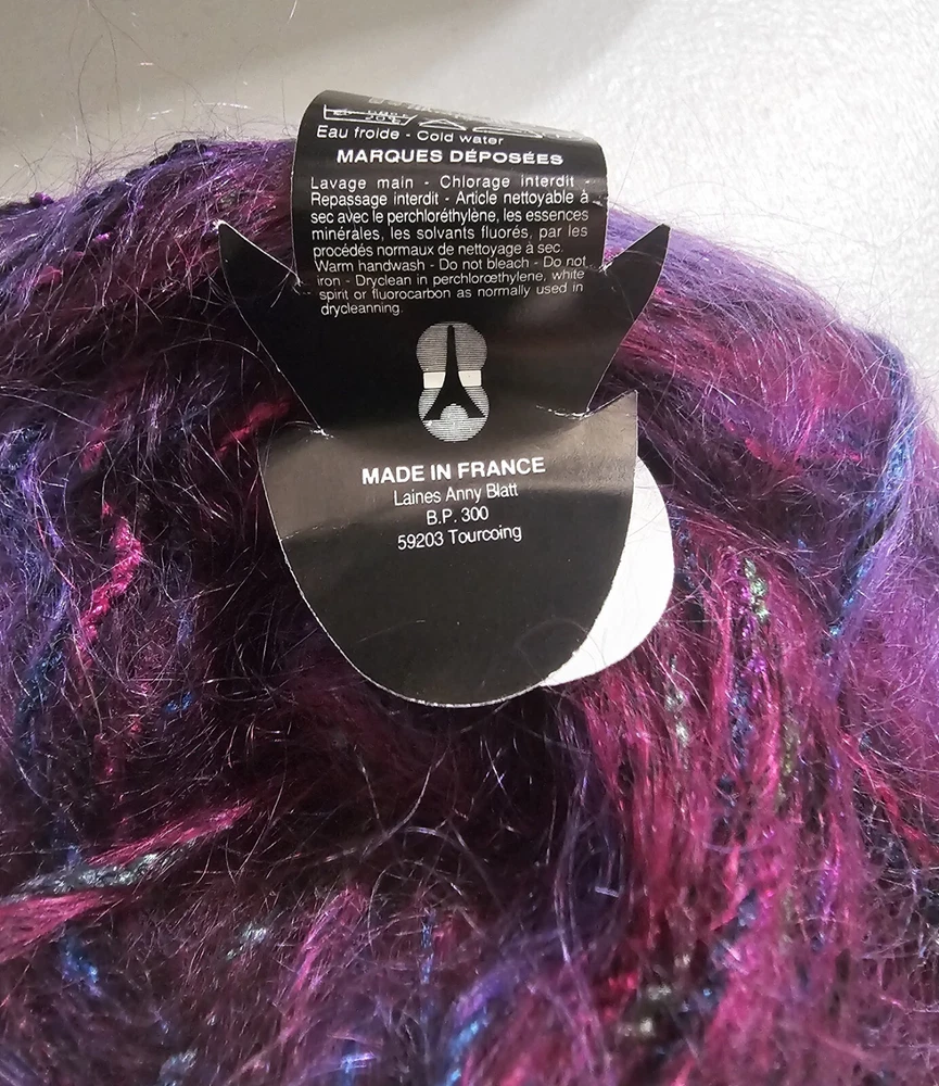 Anny Blatt Mohair blend yarn. Made in France. 50 g 71 yds. Fiber content: 46% Mohair 25% Viscose 24% Wool 5% Nylon Returns accepted within 30 days in same condition as purchased. Buyer pays return shipping. Shipping USPS ground.