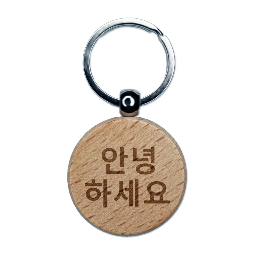Annyeonghaseyo Korean Greeting Hello Engraved Wood Round Keychain Tag Charm