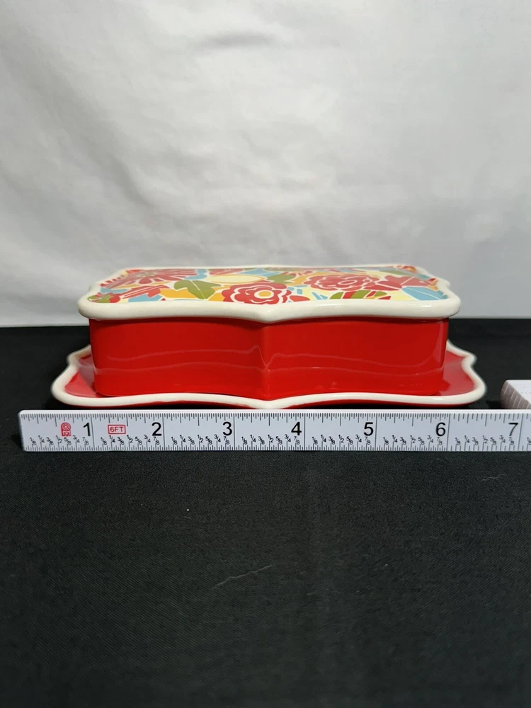 Add a touch of elegance to your kitchen with this beautiful covered butter dish from Anthropologie. The dish features a red floral pattern that will brighten up any table setting. The glossy finish on the ceramic material makes it easy to clean and maintain. This covered dish is perfect for keeping your butter fresh and presentable. It is not part of a custom bundle and is the ideal addition to your dinnerware collection. Use it for special occasions or everyday use, and impress your guests with its stylish design.