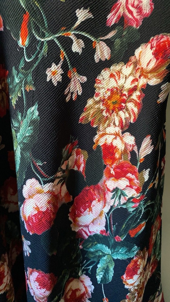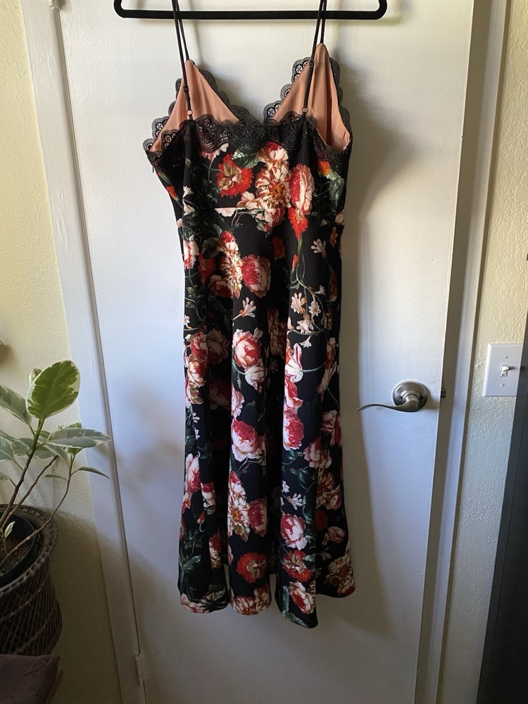 37.5” long The Anthropologie Foxiedox Midi Dress in size L features a beautiful autumnal black lace design with vintage floral accents. This fit & flare style dress has a sweetheart neckline, sleeveless design, and a zipper closure. Perfect for weddings, parties, or formal occasions, this polyester blend dress is lined and includes adjustable straps for added comfort. With a bohemian flower theme, this midi dress is versatile for summer, fall, and spring seasons.