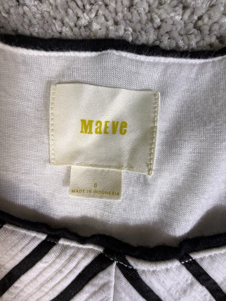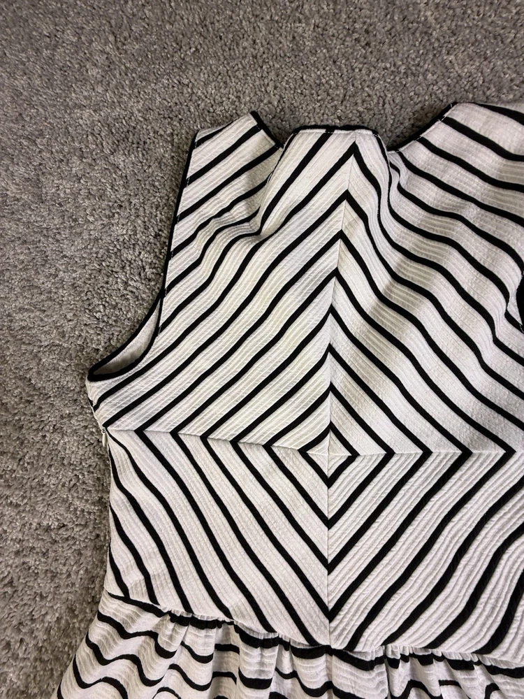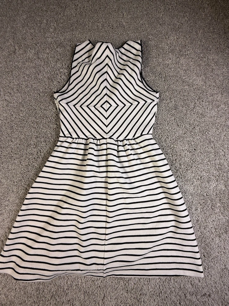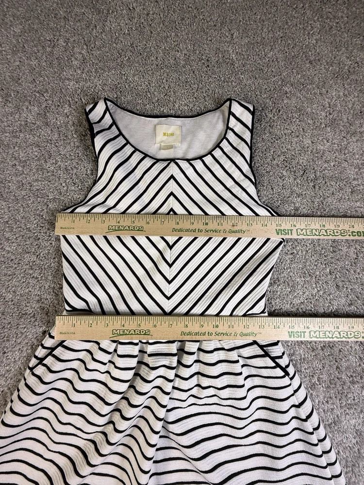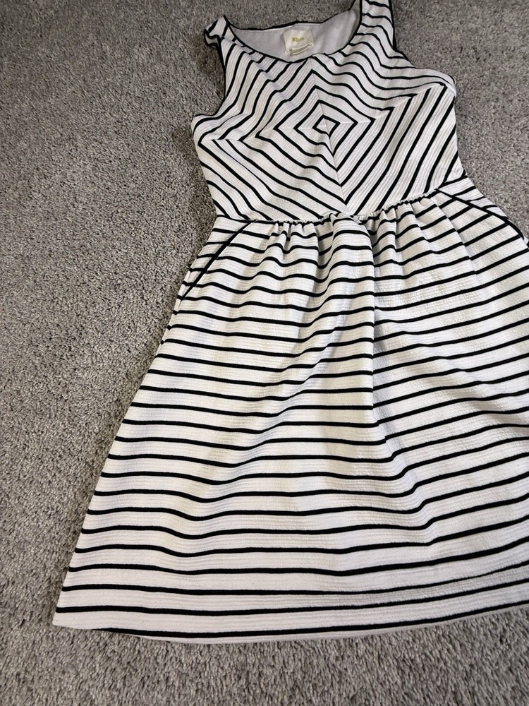 The Anthropologie Maeve Dress in size 8 is a stylish fit & flare dress featuring a round neck and sleeveless design. The dress is in a white and black striped pattern with pockets for added convenience. Made from polyester, this short dress is machine washable for easy care. With its flattering silhouette and on-trend details, this Anthropologie dress is a versatile and chic addition to any woman's wardrobe. 3854