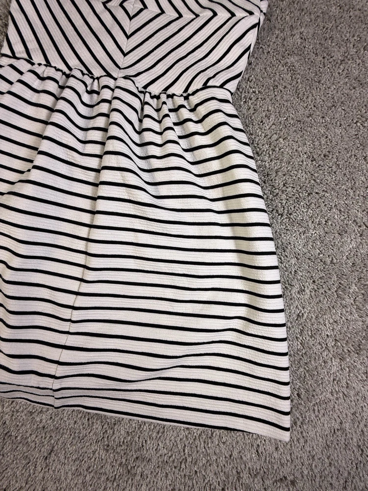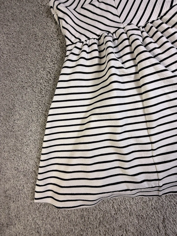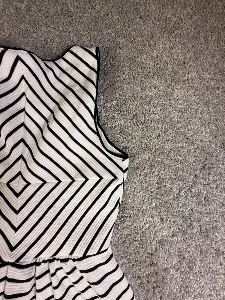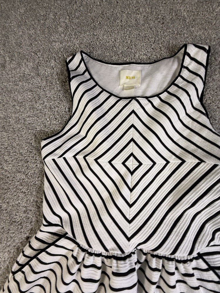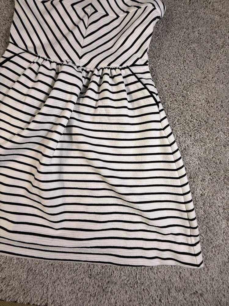 The Anthropologie Maeve Dress in size 8 is a stylish fit & flare dress featuring a round neck and sleeveless design. The dress is in a white and black striped pattern with pockets for added convenience. Made from polyester, this short dress is machine washable for easy care. With its flattering silhouette and on-trend details, this Anthropologie dress is a versatile and chic addition to any woman's wardrobe. 3854