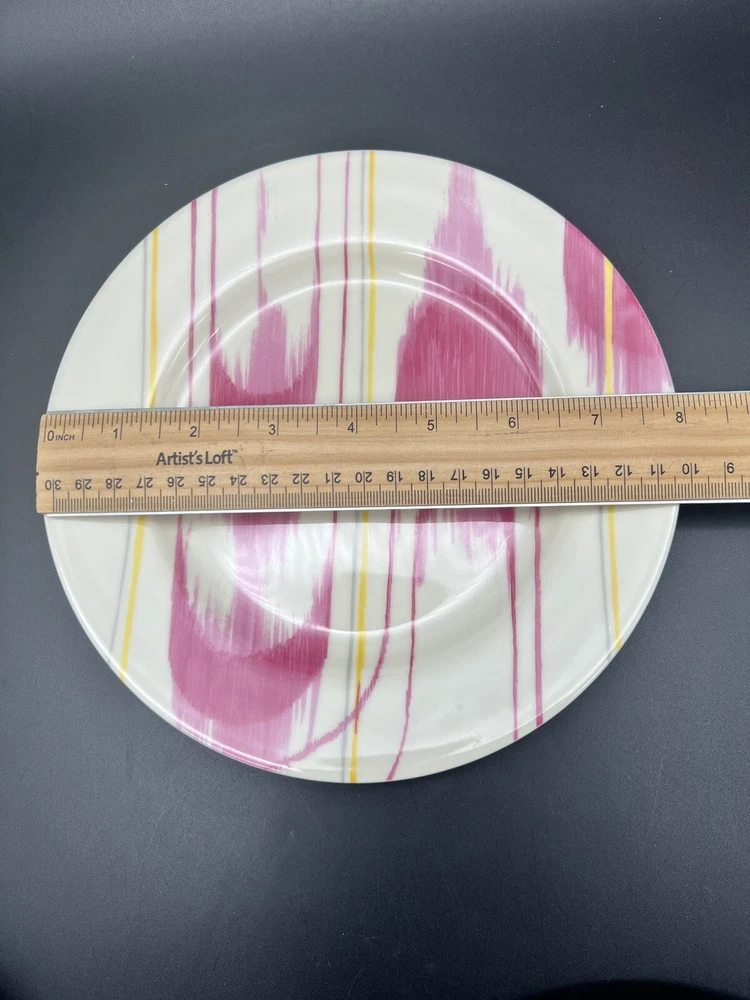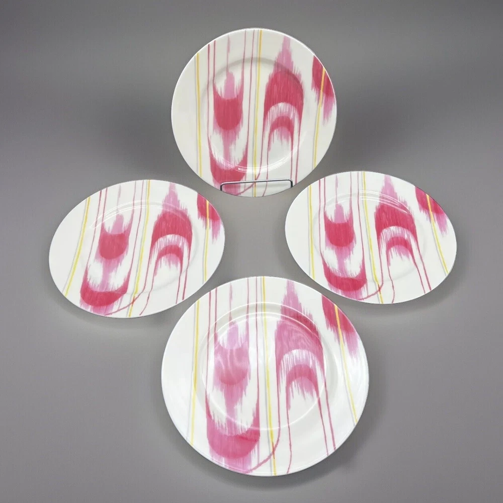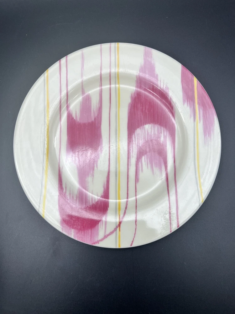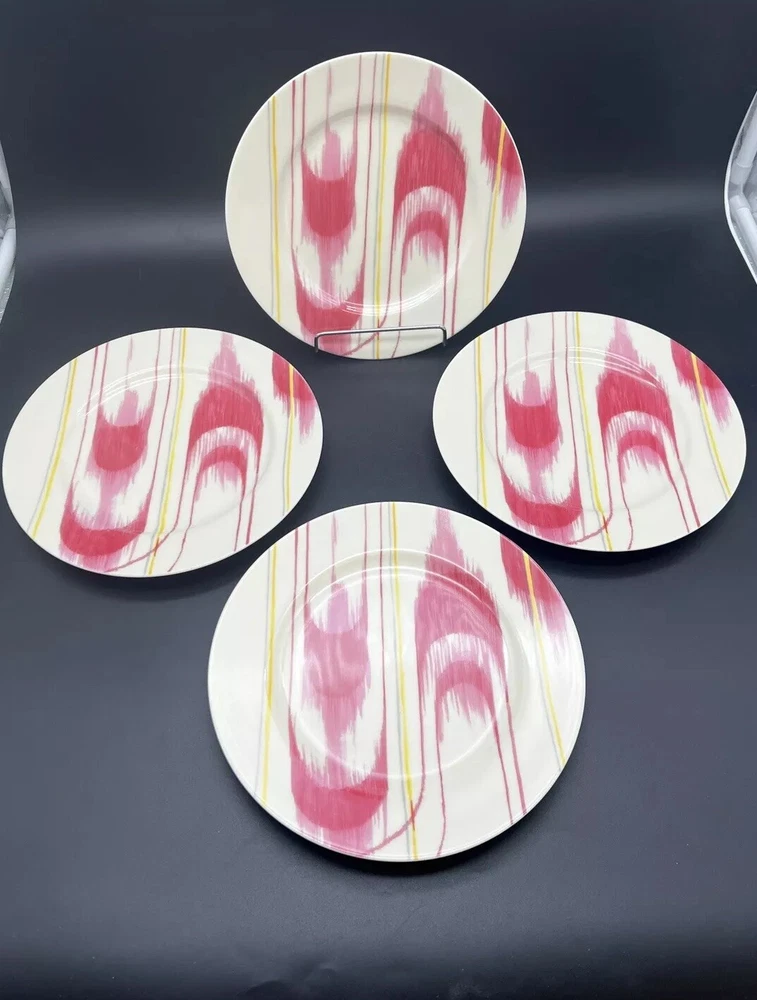 Add a touch of modern elegance to your dining table with this set of four Anthropologie Abstract Modern Graphic 8" Salad Plates. The round plates feature a unique abstract graphic pattern in a beautiful raspberry color. Three of plates are new and have their original sticker on them. One plate shows some usage with some slight utensil marks. Please see all photos. Thanks for viewing!