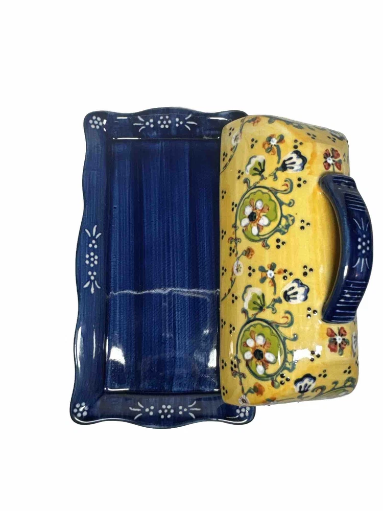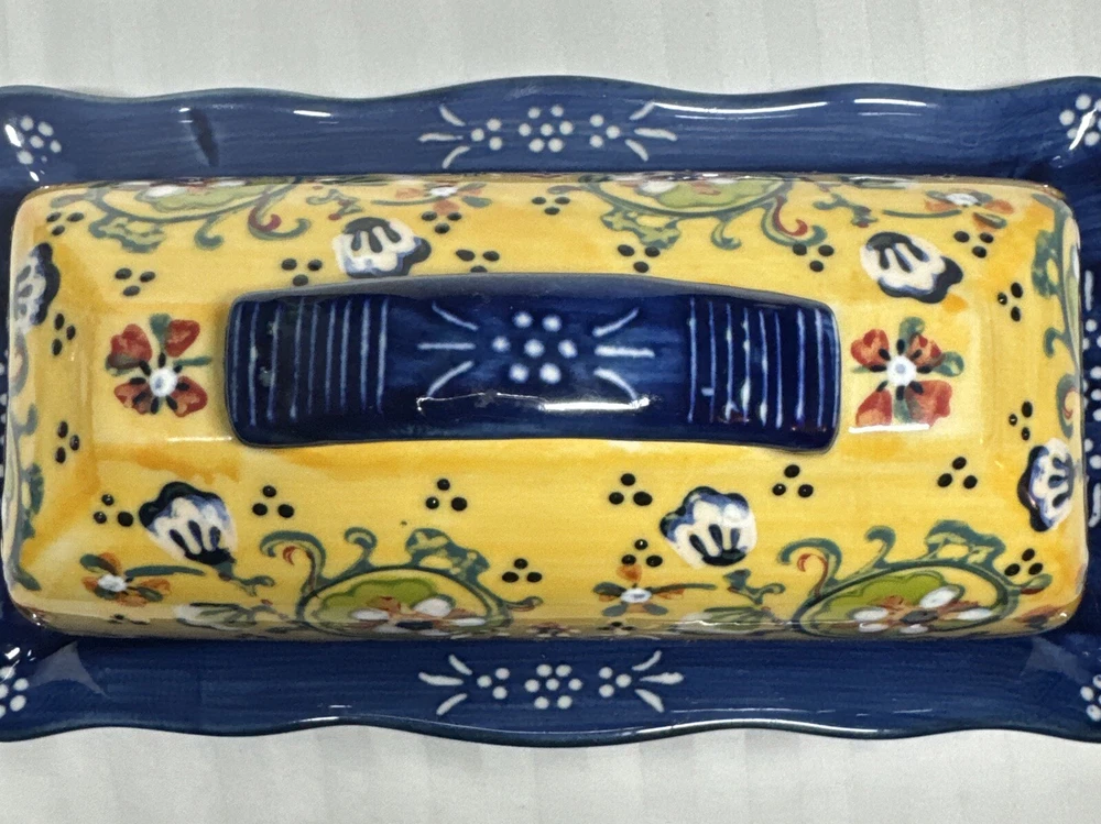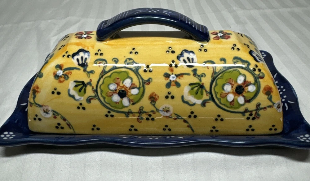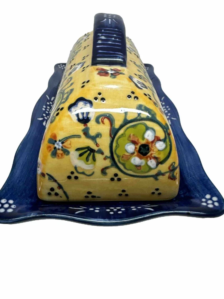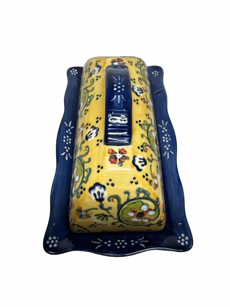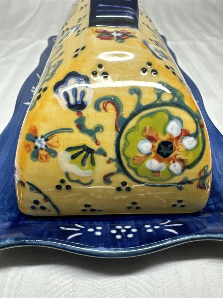 Anthropologie Yellow Blue Floral Ceramic Handpainted Print Covered Butter Dish EUC Please see all photos. Thank you for viewing this listing .
