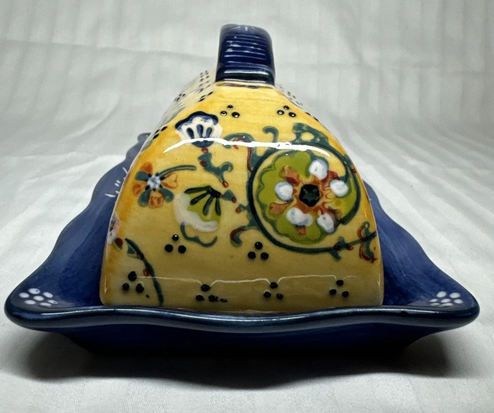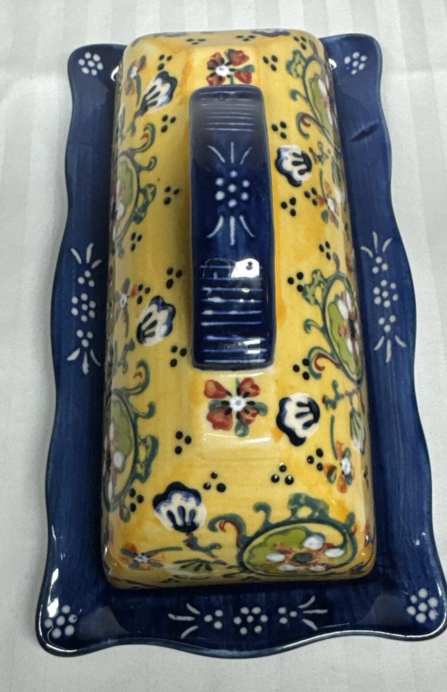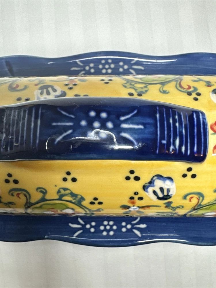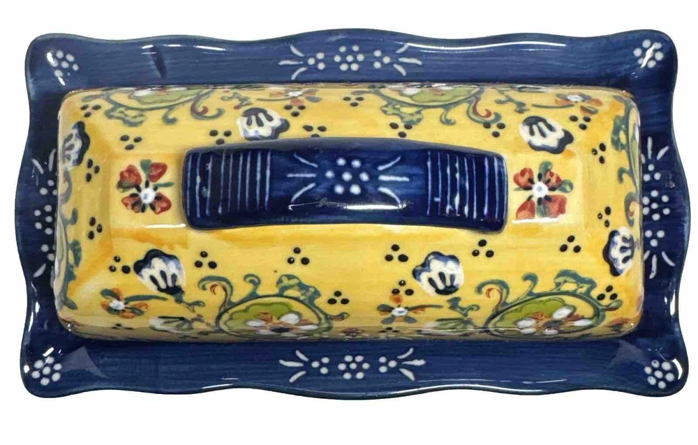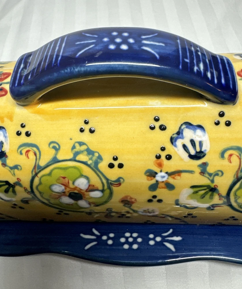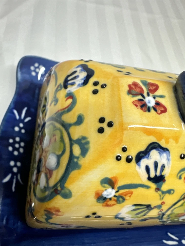 Anthropologie Yellow Blue Floral Ceramic Handpainted Print Covered Butter Dish EUC Please see all photos. Thank you for viewing this listing .