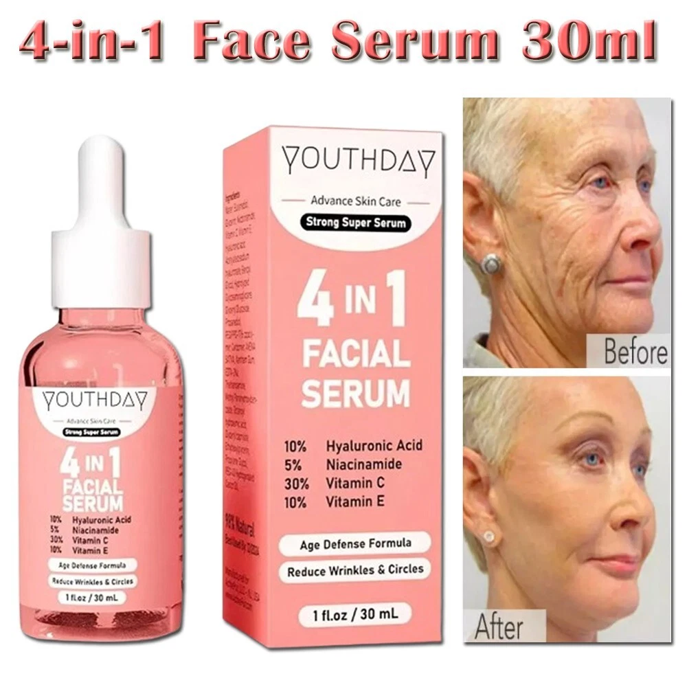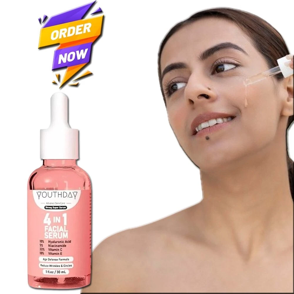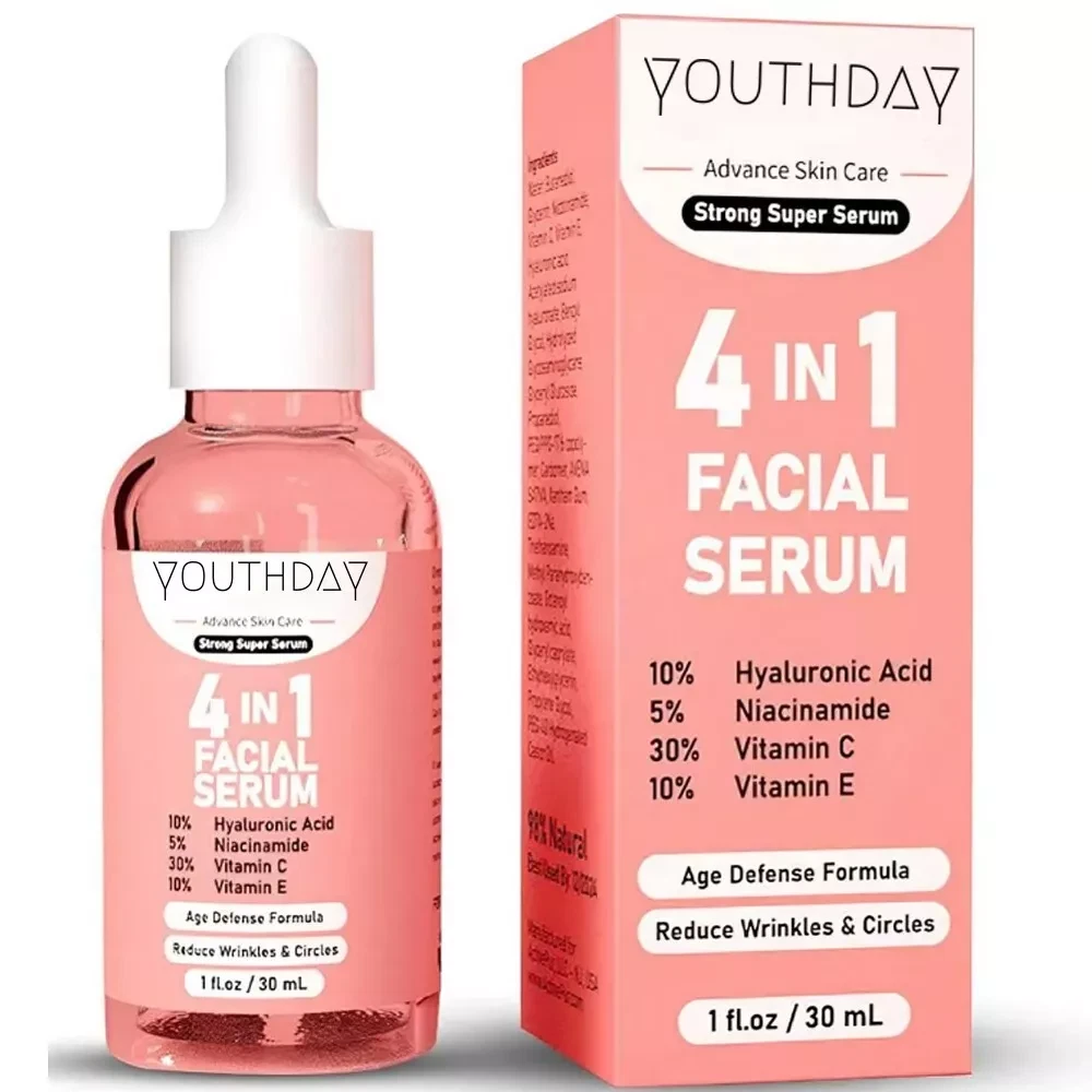 4in1 Face Serum with 10% Hyaluronic Acid + 5% Niacinamide + 30% Vitamin C + 10% Vitamin E 4-in-1 Face Serum - 30ml / 1 fl oz. 4-in-1 FACE SERUM BENEFITS: Hydrates Deeply : 10% Hyaluronic Acid for intense hydration and plumping effect. Reduces Fine Lines : Niacinamide (5%) minimizes fine lines and wrinkles. Brightens Skin : 30% Vitamin C enhances radiance and evens out skin tone. Protects & Nourishes : 10% Vitamin E provides antioxidant protection and nourishment. 4-in-1 FACE SERUM INGREDIENTS: Hyaluronic Acid (10%) : Attracts and retains moisture in the skin. Niacinamide (5%) : Reduces inflammation and improves skin elasticity. Vitamin C (30%) : Potent antioxidant that brightens and smooths skin. Vitamin E (10%) : Protects against free radical damage and supports skin healing. How To Apply This Serum: Cleanse : Start with a clean face. Apply : Dispense a few drops onto your fingertips. Distribute : Gently pat the serum onto your face and neck. Absorb : Allow it to fully absorb before applying moisturizer. Frequency : Use morning and night for best results. FAQs: Q: Can this serum be used on sensitive skin? A: Yes, it's formulated to be gentle, but it's best to do a patch test first. Q: Can I use this serum under makeup? A: Absolutely, it works well as a hydrating and protective base. Q: How long until I see results? A: Most users see noticeable improvements within 4-6 weeks of consistent use. Q: Can I use it with other skincare products? A: Yes, it can be layered with other products, but avoid using it with other strong actives like retinoids initially to prevent irritation. Q: Is it suitable for all skin types? A: Yes, it's designed for all skin types, including dry, oily, and combination skin. Note: This Product is designed to deliver optimal results, offering high-quality performance and satisfaction. Please note that individual experiences and outcomes may vary based on personal use, preferences, and unique circumstances. For best results, we recommend following the provided guidelines and ensuring the product is used as intended. Product result may vary for every individual.