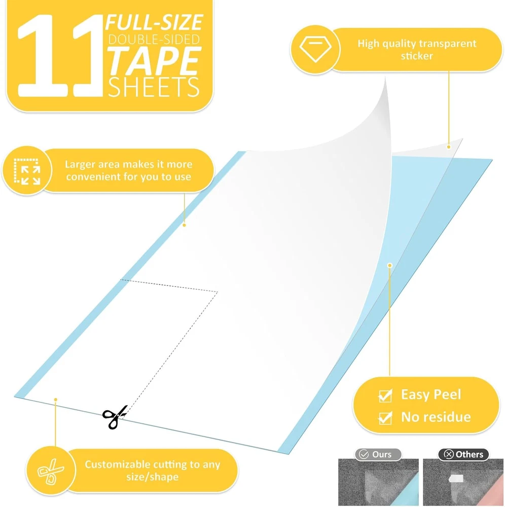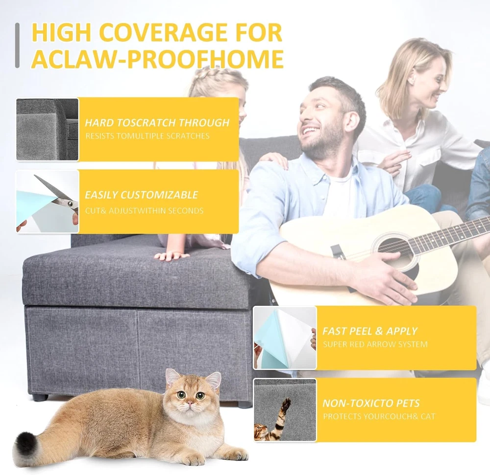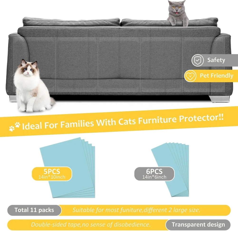 CUSTOM FIT FOR ALL FURNITURE: Say goodbye to guesswork! Our anti cat scratch furniture protector includes two sizes, 5 XL and 6 L sheets, offering a custom fit for various surfaces. Enjoy the simplicity of protecting all your furniture needs. double-sided sticky tape cover more area per sheet, providing a mess-free solution for protecting your furniture. No more messy cutting – just stick and enjoy a harmonious home. STRONG ADHESION, RESIDUE-FREE REMOVAL: XMZCYMyo tape's reliable adhesion keeps it in place during training, and when it's time to remove, there's no sticky residue left behind. Effortless protection for your furniture. TRAIN & PROTECT WITH EASE: Transform your cat's scratching habits with our game-changing Cat Scratch Deterrent and Training Tape. Train your feline friend stress-free and say goodbye to costly furniture damage. ENJOY A SCRATCH-FREE HOME: Reclaim your furniture with our ultimate Cat Scratch Deterrent & Training Tape! The flat sheets, in three sizes, offer wider coverage without the mess, ensuring a scratch-free home. Plus, our satisfaction guarantee lets you train your cat with confidence. SATISFACTION GUARANTEED: Rest easy with our 100% satisfaction guarantee. If our Cat Scratch Training Tape doesn't meet your expectations, we'll make it right – your satisfaction is our priority! Product Description You need to know before buy XMZCYMyo Cat Scratch Deterrent Tape 1.Why is the outside of the sheet also sticky? We've found that cats and other pets don't like sticky surfaces. Therefore, the cat scratch protector is our good behavior trainer and restraint measure for cat friends. So the white backing must be removed. 2.No need to cover the entire sofa. Just use the product on both sides of the sofa, and on the back or just use it where the cat scratches. It can deter cats and cats away from the sofa. After a long time of use, even if they are removed, the cat will know that the sofa cannot scratch. 3.Recommend Put the cat training sticky tape where your cat scratches often and place a scratching post near the taped surface. The cat will stop scratching the taped area and scratch the scratching post instead! How to Use Our Cat Scratch Deterrent Tape? 1.Cut the Training Sheets XMZCYMyo anti scratching sticky tape can by easily cut to the size you need. Cut & adjust within seconds. 2. Peel Off The White Backing Peel off the white backing and prepare the sticky side for use. 3. Stick The Adhesive Where You Want to Protect 4. Peel Off The Blue Backing Peel off the blue backing to expose the sticky side. Your cat will not approach it. Protect Your Furniture Against Cat Scratch(Couch, Door, Bed, Table, Corner) What’s The Size? The double-sided cat scratch deterrent tape 5 PCS XL 13.7” L 9.8”W + 6 PCS Large 13.7” L 5.9”W. Why Choose Our Anti Cat Scratch Furniture Protectors? What problem are we solving? As a pet owner, offer a good way to solve the problem - reduce the damage of PAWS on furniture, and train your cat where not to scratch. Our Double Side Couch Protector for Cats are simple and practical, save your time and energy, and let my pets better accompany us Suitable Size Two different sizes to choose, more convenient and flexible, 5 PCS XL 13.7” L 9.8”W + 6 PCS Large 13.7” L 5.9”W. Protect the aesthetics 100%Transparent, virtually invisible protection Purrfectly Safe No harmful substances, keep cats and furniture safe Residue-free & No marks Your furniture is guaranteed to be flawless REMEMBER: We do not recommend using our cat training tape on artificial leather or genuine leather. 1. Cut, peel and apply a small piece of protective film, then test in the hidden area. 2. Apply it and leave it for48 hours. 3. Remove and check your furniture. 4.If the material is intact, apply the rest of the protectors