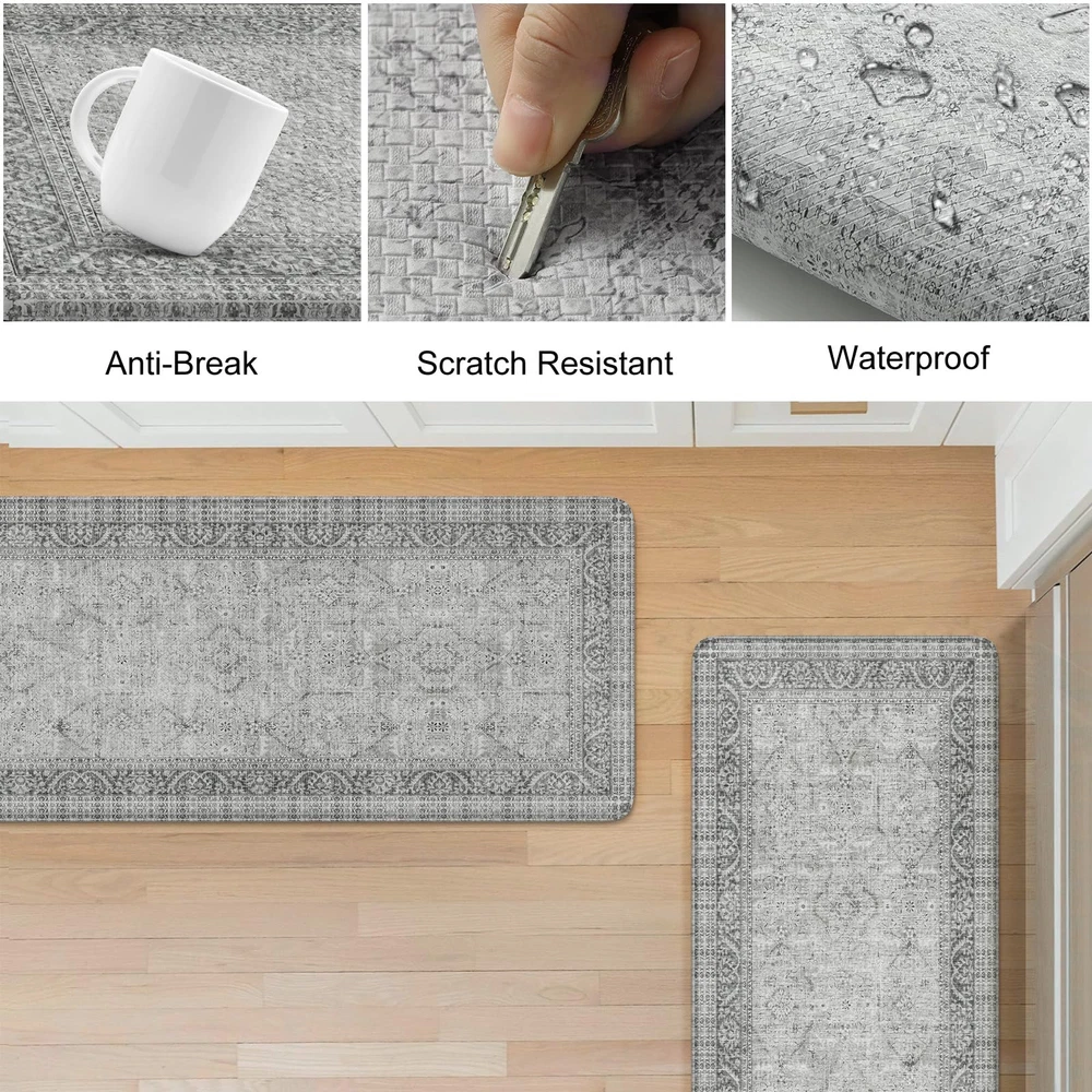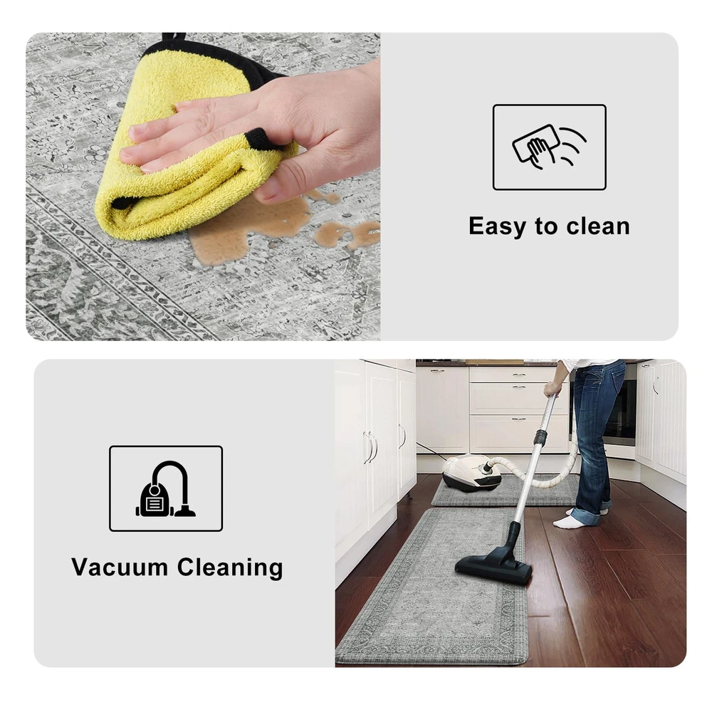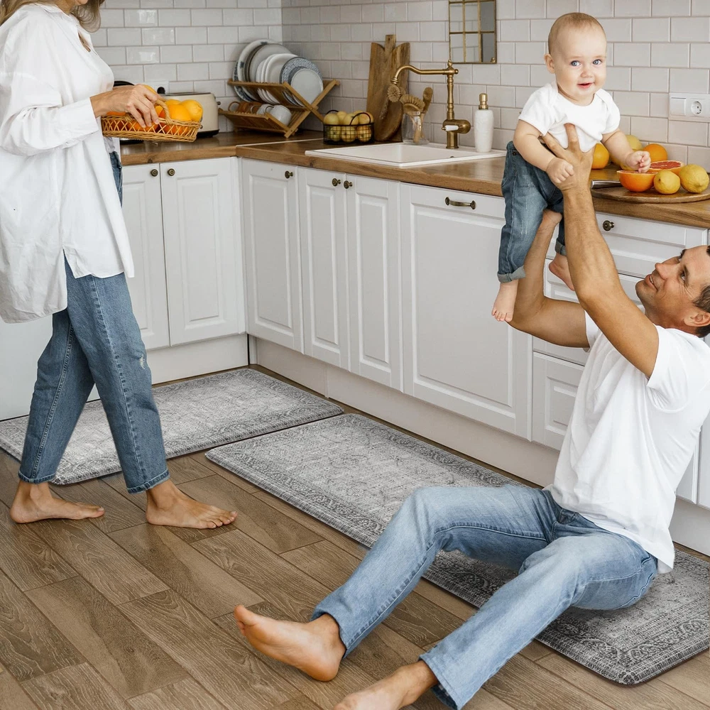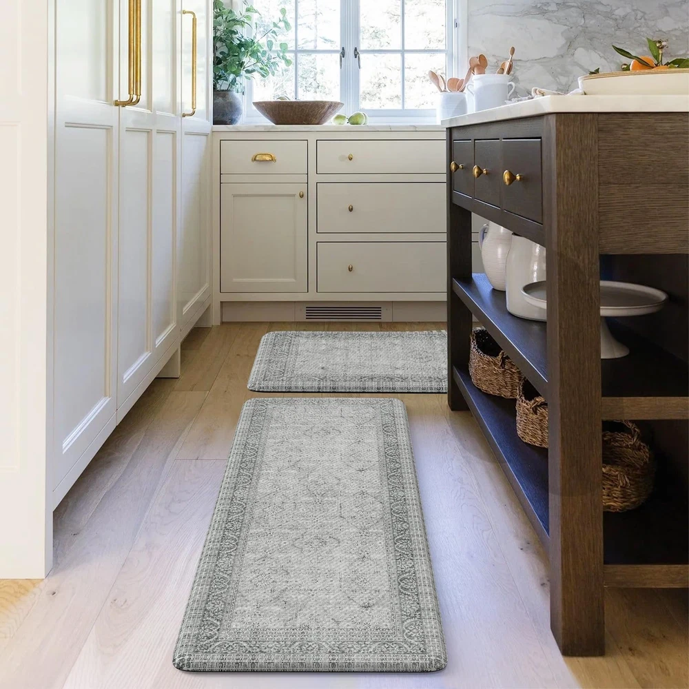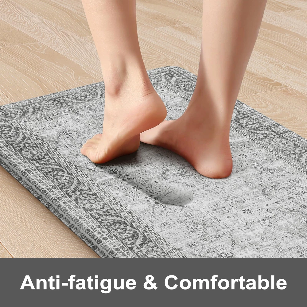 Comfort Anti-fatigue Kitchen Mats: 0.47inch (12mm) extra thick anti fatigue kitchen floor mat are sure to provide cushion on your feet, knees, lower back, and joints for standing.Feel comfortable like walking on a firm but soft cloud when you are cooking in kitchen or working at your standing desk Kitchen Rugs Set 2PC: The set contains 2 rectangular kitchen mats measure 17.3"x 47"+17.3"x 29".The comfort standing mat are made of high-quality and premium PVC materials,to ensure that the mats will keep their shape, even with extended and long-term heavy duty use Anti-Slip & Safty: The super non-slip heavy duty natural rubber backing help farmhouse kitchen rugs to keep sturdy and prevent shifting or slipping,provide safety for your family,especially pregnant women,elderly and kids.The kitchen floor mat may be used on multiple surfaces.NOTE:Rug should be placed on dry surface during use Easy Clean & Waterproof: The cushioned kitchen carpets is stain resistant,waterproof and easily cleaned.Simply wipe the floor mat with a damp cloth or sponge or use a hand-held vacuum as needed,save your time and energy Versatile: Vintage farmhouse style kitchen rug,easily to match your kitchen decor,bright your home.Soft thick foam provides ample support for standing in kitchen sink,laundry room, office,bathroom,dinning room,or any other high-traffic area