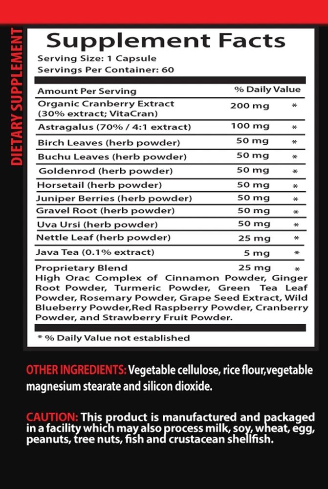 KIDNEY CLEANSE COMPLEX Dietary Supplement Made in USA 1 Bottle 60 Capsules Benefits: KIDNEY SUPPORT INFLAMMATORY CONTROL IMMUNE FUNCTION INCREASE DIGESTION HEALTH BOOST CARDIOVASCULAR HEALTH SUPPORT BOOST SKIN & HAIR HEALTH SLOW AGING KIDNEY CLEANSE COMPLEX The ingredients included in this bottle are: Organic Crannberry extract, Astralagus , Birch leaves, Buchu leaves, Goldenrod , Horsetail herb, Juniper Berry , Gravel Root , Uva Ursi, Nettle Leaf , Java Tea . Proprietary blend of: Cinnamon powder, ginger root powder, turmeric powder, green tea leaf powder, rosemary powder, grape seed extract, wild blueberry powder, red raspberry powder, crannberry powder, and strawberry fruit powder. Inflammation is at the root of many common conditions seen in developed nations, including heart conditions, autoimmune conditions, and more. Anti-inflammatory foods like cranberries help naturally combat inflammation due to their antioxidants. All berries help fight free radicals due to being high in antioxidants, but cranberries prove to be one of the best sources on earth. According to some studies, cranberry extract can improve multiple aspects of immune function, and it can lower the frequency of cold and flu symptoms. The high levels of a specific substance called proanthocyanidins that are found in cranberries helps the body’s immune function to fight off health conditions. Birch leaves can help boost the body’s immune system as well. Digestive health benefits from cranberries are undeniable because of the fruit’s ability to balance bacteria in the body, decreasing “bad” bacteria and facilitating in the growth of “good” beneficial bacteria. This not only relieves digestion symptoms and also helps boost immunity and nutrient absorption, since a healthy gut wall is important for both of these functions. Since birch leaves are a diuretic it is only natural that it causes you to number one alot, so make sure to drink enough water. Betulenol and Butylene are the two components which are responsible for this property. Urination helps the body in many ways. Buchu may promote the removal of waste, such as compounds like uric acid, excess salts, excess water, and fat by increasing urination, both in frequency and quantity. This also helps to keep the urinary tracts and kidneys clean. Studies have shown astralagus's ability to reduce blood pressure and level of triglycerides. High levels of triglycerides put individuals at risk for many forms of heart conditions . The flavonoids in Astragalus have an excellent antioxidant action that helps reduce free radical damage to arterial walls and the heart tissue. Astralagus also may regulate cholesterol and triglyceride levels to proper concentrations for the heart to work in a less stressed environment. For ages, birch oil has been in use as a skin toner. Its astringent property strengthens gums, hair, and tightens muscles. Thus it may make you look younger and may help you get back into a more youthful lifestyle, even when you are well into your forties or fifties. Astragalus is well-known for its anti-aging effect. In fact, the primary use of this herb is geared to promoting longevity. It seems to have solid scientific basis too, since a component of Astragalus called cycloastragenol is found to increase telomerase, an enzyme that promotes telomere health. Telomere length reflects aging health more accurately than time. Supplement Facts Serving Size: 1 Capsule Servings Per Container: 60 Amount Per Serving % Daily Value Organic Cranberry Extract (30% extract; VitaCran) 200 mg* Astragalus (70% / 4:1 extract) 100 mg * Birch Leaves (herb powder) 50 mg * Buchu Leaves (herb powder) 50 mg * Goldenrod (herb powder) 50 mg * Horsetail (herb powder) 50 mg * Juniper Berries (herb powder) 50 mg * Gravel Root (herb powder) 50 mg * Uva Ursi (herb powder) 50 mg * Nettle Leaf (herb powder) 25 mg * Java Tea (0.1% extract) 5 mg * * % Daily Value not established Proprietary Blend : High Orac Complex of Cinnamon Powder, Ginger Root Powder, Turmeric Powder, Green Tea Leaf Powder, Rosemary Powder, Grape Seed Extract, Wild Blueberry Powder,Red Raspberry Powder, Cranberry Powder, and Strawberry Fruit Powder. OTHER INGREDIENTS : Vegetable cellulose, rice flour,vegetable magnesium stearate and silicon dioxide. CAUTION : This product is manufactured and packaged in a facility which may also process milk, soy, wheat, egg, peanuts, tree nuts, fish and crustacean shellfish SUGGESTED USE : 1 capsule taken 1 to 2 times daily preferably with meals or as directed by a healthcare professional. Do not exceed recommended dose. Pregnant or nursing mothers, children under 18, and individuals with a known medical condition should consult a physician before using this or any dietary supplement. If you are taking a birth control pill, are considering becoming pregnant or have questions about the advisability of taking this product, consult your physician prior to use. These statements have not been evaluated by the Food and Drug Administration. This product is not intended to diagnose, treat, cure or prevent any disease. PREMIUM FORMULA SUPPLEMENT At VIP Vitamins, we are dedicated to delivering an exceptional experience by using only the finest, premium ingredients.