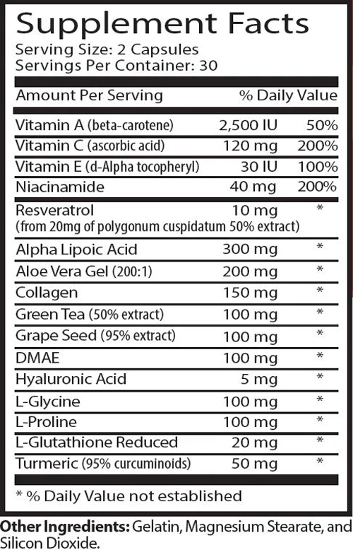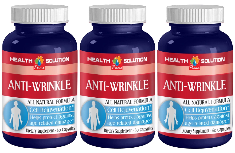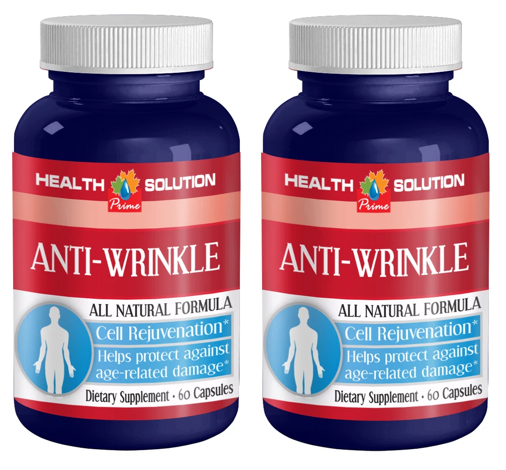 ANTI WRINKLE ALL NATURAL FORMULA 2 Bottles 120 Capsules Manufactured For Health Solution Prime Made in USA B enefits: Helps to protect against Age-related skin damage Cell Rejuvenation Aging of skin. Your skin changes with age. That's about a lifetime of sun exposure, personal habits such as smoking and diet, and changes that happen with normal aging. As you get older, you may notice your skin isn't as smooth or tight as it once was. It may also be drier, more fragile, and thinner than it used to be. With age, skin may also bruise more easily, due to loss of support around blood vessel walls that happens with age. Below the skin's surface, losing fat in your cheeks, temples, chin, nose, and around your eyes may loosen skin and give your face a leaner look. If you lose bone around your mouth and chin, the skin around your mouth may pucker. Even the nose may change, if you lose cartilage there. You may notice "lines" on your face, as early as your 30s and 40s, that result from the expressions you make. These include horizontal lines on your forehead and small, curved lines on your temples, upper cheeks, and around your mouth. Even gravity plays a role. When the skin becomes less elastic, gravity makes eyebrows and eyelids droop, creates looseneess and fullness under the cheeks and jaw (jowls and "double chin"), and lengthens ear lobes. You can't fight gravity. But there are other factors that you control, especially how you protect your skin from the sun and whether you smoke. Sun Damage : Over time, the sun's ultraviolet (UV) light damages certain fibers in the skin called elastin. The breakdown of elastin fibers causes the skin to sag, stretch, and lose its ability to snap back after stretching. The skin also bruises, tears more easily, and takes longer to heal. So while sun damage may not show when you're young, it will later in life. Nothing can completely undo sun damage, although the skin can sometimes repair itself. So, it's never too late to begin protecting yourself from sun exposure. You can delay changes associated with aging by limiting your time in the sun and wearing sunscreen with zinc oxide as a physical blocker and an SPF of 30 or more. Also, wear clothing to cover skin exposed to sun, broad-brimmed hats and sunglasses. Smoking : Smokers tend to have more wrinkles than nonsmokers of the same age, complexion, and history of sun exposure. Antiaging skincare should always include anti aging supplements because the skin is dependent upon the micronutrients (vitamins, minerals, and phytochemicals or phytonutrients) to rebuild collagen, maintain moisture, and reverse aging by reducing of eliminating wrinkles from the INSIDE as well as the OUTSIDE! What are the benefits of "ANTI WRINKLE. ALL NATURAL FORMULA" basic Ingredients? Vitamin C (ascorbic acid). Vitamin C is an antioxidant present in many fruits and vegetables. Also known as L-ascorbic acid, vitamin C has a wide variety of uses in the body. It supports normal growth and development and helps the body repair damaged tissue. Vitamin C also assists in the production of collagen, a protein that’s necessary for healthy skin, cartilage, tendons, ligaments, and blood vessels. To say that vitamin C is beneficial would be an understatement. It influences iron absorption and helps fight cell-damaging free radicals. A 16-year study found that regular vitamin C supplementation promoted heart health. Additionally, people who consume foods rich in vitamin C or other antioxidants may lower their risk of high blood pressure. Vitamin E (d-Alpha tocopheryl) “Vitamin E” is the collective name for a group of fat-soluble compounds with distinctive antioxidant activities. Antioxidants protect cells from the damaging effects of free radicals, which are molecules that contain an unshared electron. Free radicals damage cells and might contribute to the development of cardiovascular problems. Vitamin E is a fat-soluble antioxidant that stops the production of ROS (reactive oxygen species) formed when fat undergoes oxidation. Scientists are investigating whether, by limiting free-radical production and possibly through other mechanisms, vitamin E might help prevent or delay the chronic health problems associated with free radicals. Niacinamide When vitamin B3, or niacin, combines with amino acids of another molecule, the chemical reaction produces niacinamide, also known as nicotinamide or nicomide. Most people receive a daily recommended allowance of vitamin B3 through the consumption of nuts, fish, fortified breads and cereals, and multivitamins, but according to the Pharmacy Mix blog, it is most effective in the care of skin conditions when used topically. Reverses Signs of Aging and may be an optional for wrinkles. Resveratrol Resveratrol is a natural antioxidant compound found in high amounts amongst the skins of grapes and in red wine. When ingested it can reduce inflammation in the blood vessels and improve their function, preventing them from clumping together to form the clots that lead to a impact heart health. For youthful skin to thrive it needs collagen and elastin, which free radicals can affect the production of. Resveratrol is a particularly potent antioxidant that neutralizes free radical damage and allows the collagen to keep on pumping. It has become a world-famous anti-ageing ingredient which reverses aging (includes elimination or reduction of wrinkles like crows feet and forehead wrinkles). The way it banishes wrinkles and may improve firmness is similar to the regenerating process that allows grape vines to live for a century. Vitamin A (beta-carotene) Beta-carotene is a red-orange pigment found in plants and fruits, especially carrots and colorful vegetables.The human body converts beta-carotene into vitamin A (retinol) - beta-carotene is a precursor of vitamin A. We need vitamin A for healthy skin and mucus membranes, our immune system, and good eye health and vision. Beta-carotene in itself is not an essential nutrie