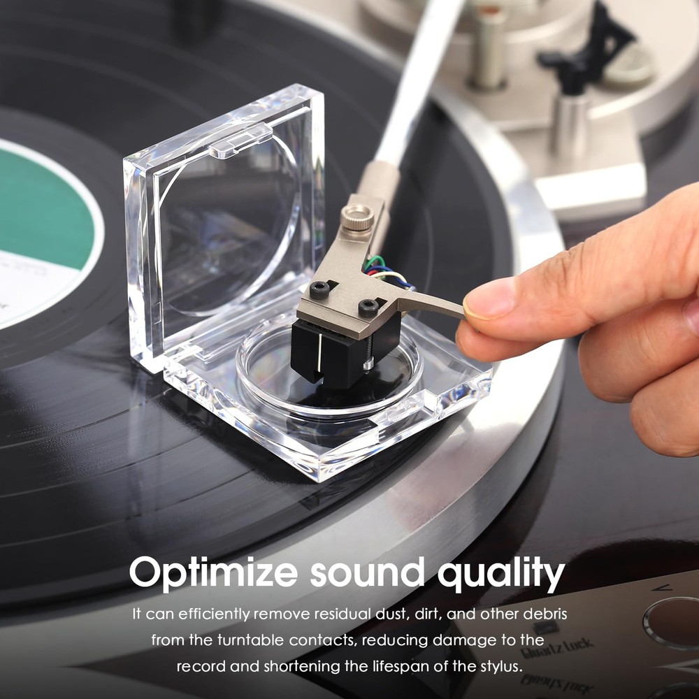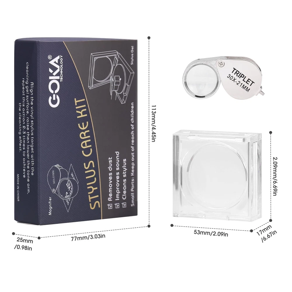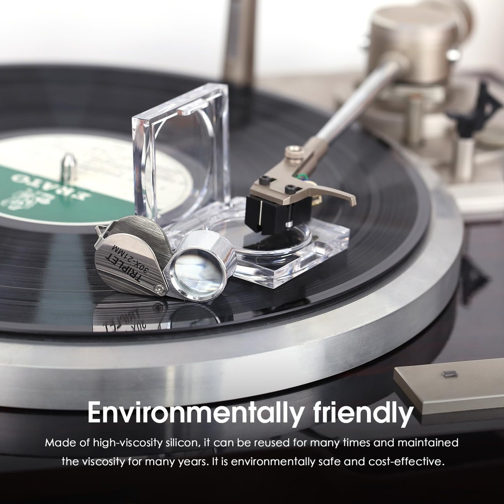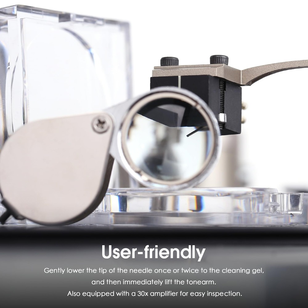 Parameters Model: R49A Dimensions of cleaning gel: 53*17*53mm / 2.09*6.67*2.09in Package dimensions(W*D*H): 77*25*113mm / 3.03*0.98*4.45in Net weight: 65g / 0.14lb Package weight: 100g / 0.22lb Packing List 1*Cleaning Gel 1*30x Magnifying Glass Increase the life of a stylus: It can efficiently remove residual dust, dirt, and other debris from the turntable contacts, reducing damage to the record and shortening the lifespan of the stylus. Optimize sound quality: Dust can interfere with the grooves on the stylus and record, affecting sound quality; Before playing music, you can use gel for cleaning to improve the sound quality. User-friendly: Gently lower the tip of the needle once or twice to the cleaning gel, and then immediately lift the tonearm. Also equipped with a 30x amplifier for easy inspection. Environmentally friendly: Made of high-viscosity silicon, it can be reused for many times and maintained the viscosity for many years. It is environmentally safe and cost-effective.