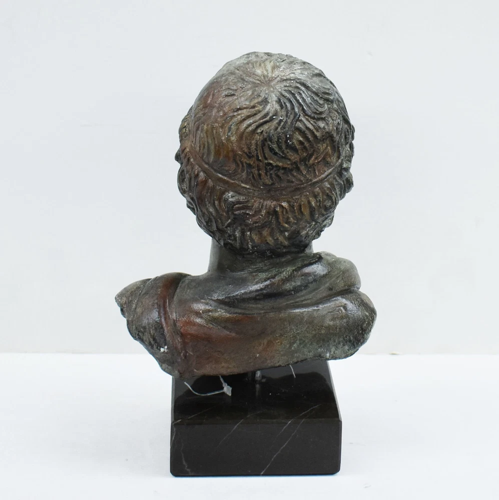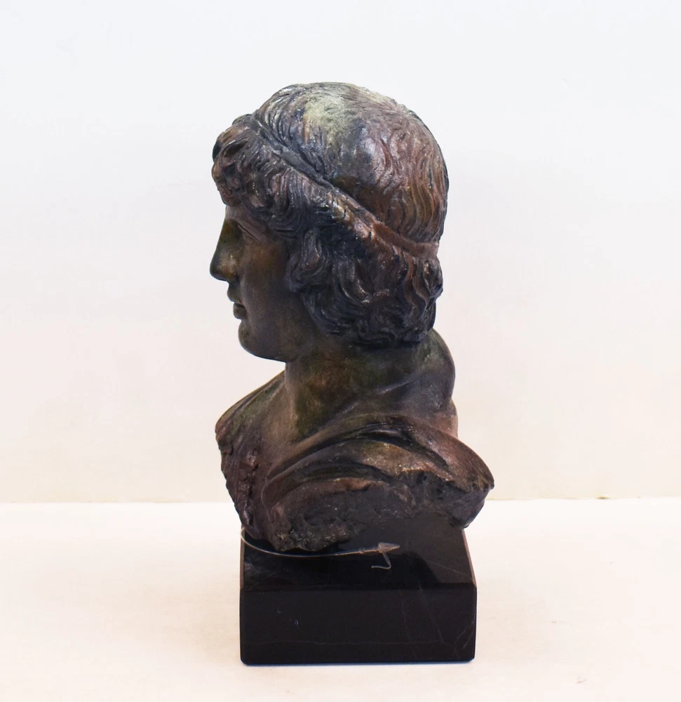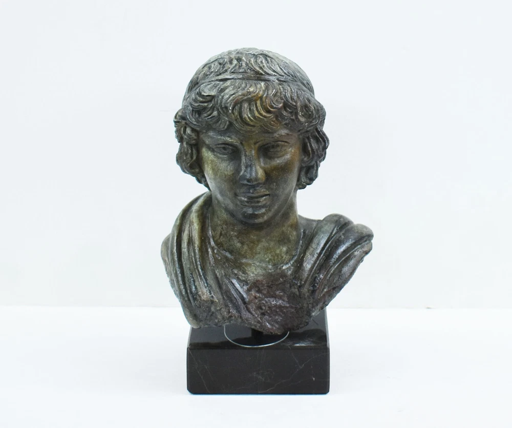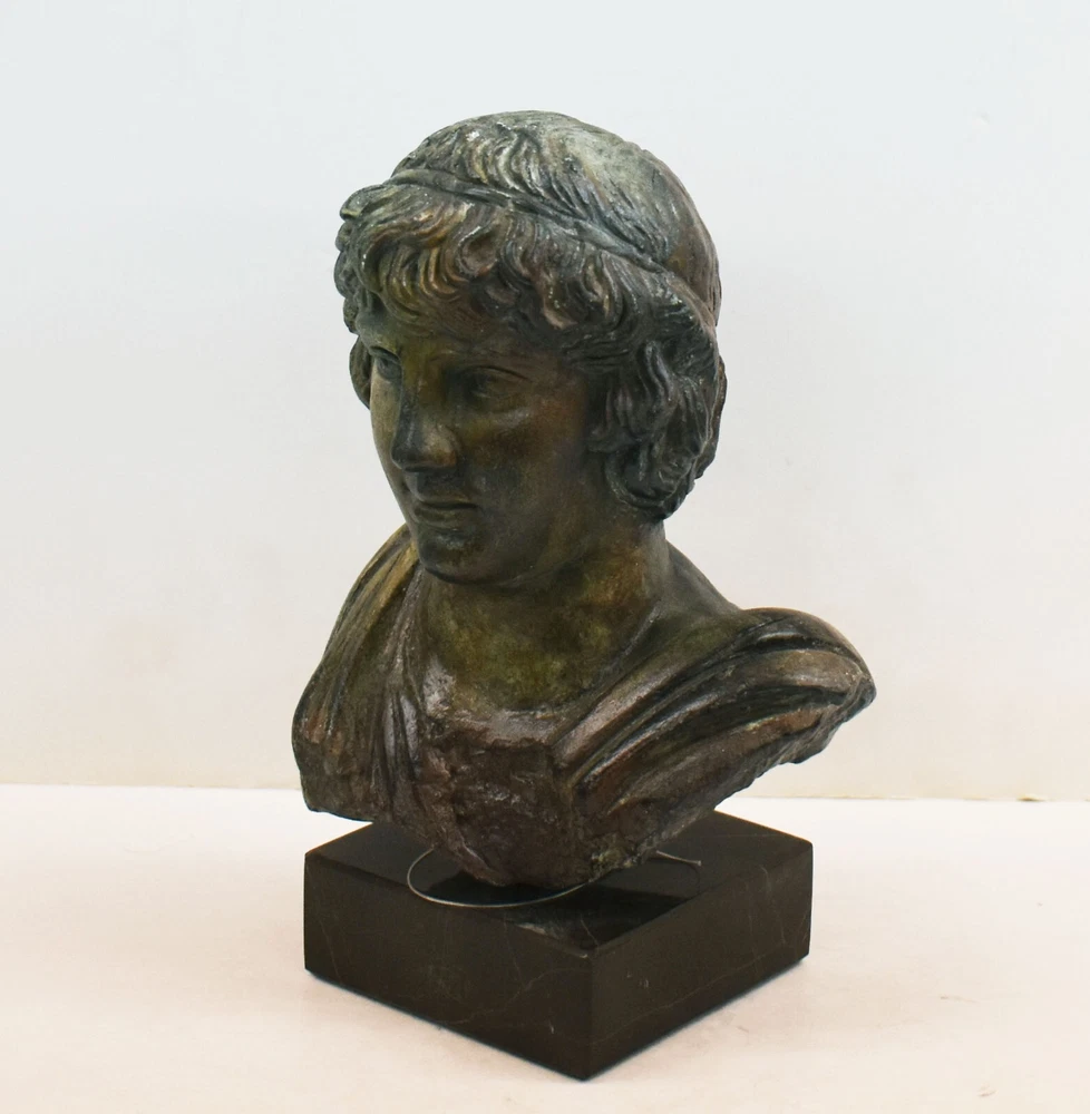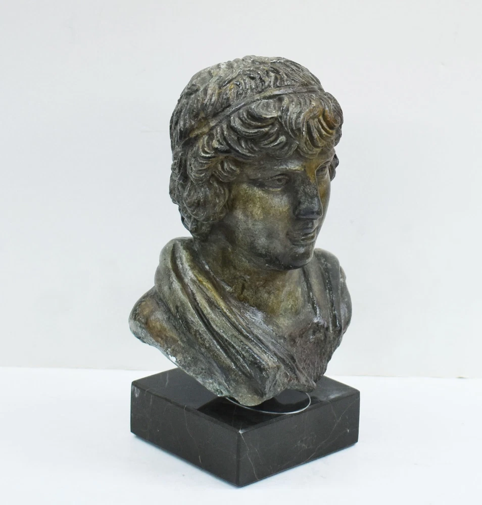ANTINOUS BUST - EMPEROR HADRIAN FAVORITE Antinous (also Antinous or Antinoos, Ancient Greek: Ἀντίνοος; 27 November, c. 111 – before 30 October 130) was a Bithynian Greek youth and a favorite of the Roman emperor Hadrian. He was deified after his death, although his exact status in the Roman pantheon was uncertain. He is frequently described and depicted as a beautiful boy and youth. The relationship is believed to have been sexual.(01-558-A) Details: Condition: New, Handmade in Greece Material: Casting stone Height: 20 cm - 7.8 inches Width: 13 cm - 5.1 inches Length: 9 cm - 3.5 inches Weight: 1.2 kg ********