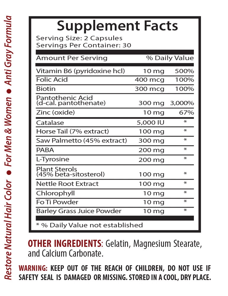 RESVERATROL 1200 & ANTI GRAY HAIR COMBO Antioxidant compound Hair support Boost hair growth Neutralize the effects of aging Promote Immune function Enhance our wellbeing Maintaining a healthy weight Many important health benefits 1 Bottle of ANTI GRAY HAIR & 1 Bottle of RESVERATROL 1200 COMBO ANTI GRAY HAIR – RESVERATROL 1200 Many of the much-touted health benefits of red wine rest firmly on the Antioxidant compound, resveratrol, found in the skins and seeds of grapes. Since red wines typically enjoy extended contact time with the grape’s skins during fermentation they will naturally have higher levels of resveratrol. Using our gray hair as part of a hair support regimen can help reduce breakage and increase your hair length. Our healthy supplements loaded with horsetail and biotin may boost hair growth. What is Resveratrol? Resveratrol is a naturally occurring, powerful compound that has some significant Antioxidant properties, which allow it to neutralize the effects of aging and improve cellular functions. Life, stress, UV damage, pathogens, pollution, and environmental changes comprise the list of compounds evaluating our health. Thankfully, a diet rich in Antioxidants, in this case resveratrol, can step in to help neutral all those changes. Health benefits that red wine and resveratrol may offer to red wine drinkers at large as well as its benefits in a supplement form. Immune system Zinc is directly involved in the support of our Immune system. Supplementing with zinc has been shown to reduce the outside influence on our bodies, Zinc supplementation may promote Immune function. Resveratrol inhibits certain components of the Immune response, which under certain conditions can enhance our wellbeing. The importance of resveratrol in the resveratrol Immune system studies as being able to turn off the Immune response. It can both enhance and inhibit branches of the Immune system. Weight Loss Biotin is helpful in reducing fat from the human body and maintaining a healthy weight. People with obesity are generally recommended to include food that is rich in this vitamin in their daily diet plan. Resveratrol may be also beneficial for brain and body energy and mat help to lose some weight. Takin our herbal supplementation with high-calorie diets along with high concentrations of resveratrol gained less weight. Heart Health: The benefits of resveratrol concluded that with high concentrations of resveratrol you may gain weight and improve many of cardiovascular-related problems, all while enjoying a longer lifespan. The relationship between red wine, resveratrol and health and indicates that resveratrol may significantly buffer the aging process on several fronts including heart health by mimicking a calorie-restricted diet. Biotin is helpful for ensuring the proper functioning of the heart by relieving it from most problems. It helps in reducing the level of cholesterol in the human body, which is a major cause of conditions for heart function. Skin Aging Resveratrol - a powerful Antioxidant found most abundantly in grapes and red wines - has been shown to provide many important health benefits. In addition to the many great things it is believed to do for cardiovascular health and weight loss, resveratrol is also believed to offer many significant Anti-aging benefits as well. Resveratrol, when taken orally, may boost healthy life span. Taking resveratrol may provide significant protection against skin aging as well. Resveratrol possesses Antioxidant potency and its powerful Antioxidant capacity may be beneficial for Anti-wrinkle support. Controls Blood Sugar Biotin is helpful in maintaining proper levels of sugar in the blood. It helps the human body to regulate sugar, thereby controlling blood sugar levels. Consuming a daily supplement of resveratrol may help with blood sugar control and improve blood pressure. Resveratrol may help to improve blood sugar metabolism. Resveratrol my control blood sugar while boosting levels of the all-important blood sugar regulating mechanisms. As an Antioxidant Resveratrol is a naturally occurring and powerful Antioxidant, which has a vast amount of beneficial properties for the skin. Not only can it help to prevent against environmental issues such as UV rays and stress, it can also protect skin from signs of aging. This makes it an excellent nutrient for anyone looking for Anti-ageing skin benefits. Due to its Antioxidant properties this natural resveratrol supplementation may be useful in improving skin elasticity, radiance and suppleness. Topically, Resveratrol can help to improve the production of Collagen. Supplement Facts Serving Size: 2 Capsules Servings Per Container: 30 Vitamin B6 (pyridoxine hcl) 10 mg 500% Folic Acid 400 mcg 100% Biotin 300 mcg 100% Pantothenic Acid (d-cal. pantothenate) 300 mg 3000% Zinc (oxide) 10 mg 67% Catalase 5,000 IU * Horse Tail (7% extract) 100 mg * Saw Palmetto (45% extract) 300 mg * PABA 200 mg * L-Tyrosine 200 mg * Plant Sterols (45% beta-sitosterol) 100 mg * Nettle Root Extract 100 mg * Chlorophyll 10 mg * Fo Ti Powder 10 mg * Barley Grass Juice Powder 10 mg * Other Ingredients: Gelatin, Magnesium Stearate, and Calcium Carbonate. SUGGESTED USE: As a dietary supplement, take two (2) capsules daily. CAUTION: Do not exceed recommended dose. Pregnant or nursing mothers, children under the age of 18, and individuals with a known medical condition should consult a physician before using this or any dietary supplement. This product is manufactured and packaged in a facility which may also process milk, soy, wheat, egg, peanuts, tree nuts, fish, and crustacean shellfish. Supplement Facts Serving Size: 2 Capsules Servings Per Container: 30 Proprietary Blend 1,200 mg * Resveratrol (from polygonum cuspidatum, standardized extract), Pomegranate, Green Tea, Quercetin (from Citrus Bioflavonoids), Grape Seed Extract (standardized for polyphenols), Acai (4:1 extract), Enzymes OTHER INGREDIENTS: Calcium Carbonate, Magnesium Ste