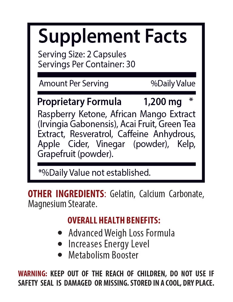 RASPBERRY KETONES & CLA COMBO Advanced Weigh Loss Formula Increases Energy Level Metabolism Booster Cuts cravings of sugar or carbohydrate or salt Modify the body composition and cardiovascular function Reduce the body fat levels Weight loss benefits Keep a healthy balance of cholesterol Improve heart function Help immune system function Made In USA COMBO CLA - RASPBERRY KETONES COMBO Conjugated linoleic acid (CLA) is highly found in fats from ruminants and it appears to favorably modify the body composition and cardiovascular function. The capacity of CLA to reduce the body fat levels. Furthermore, CLA supplementation may modulate the immune function. Regular consumption of this natural CLA may shown some benefits of CLA supplementation as the Weight loss. Raspberry ketone is a compound that is found in red raspberries. Red raspberries are rich in vitamin C, and are an excellent source of riboflavin, niacin and folic acid. A special ketone in red raspberries has traditionally been used to improve and prevent different health problems including metabolic problems and cholesterol. Raspberries are also known to contain Antioxidants. Improves Heart Health CLA has been shown to have a very high content of omega-6 fatty acids, which is a beneficial type of fatty acid that our body needs. It is otherwise known as linoleic acid. This acid can help the body to keep a healthy balance of cholesterol in the body, which may be beneficial for promoting the heart health. The dietary intake of the CLA supplementation may have some major effects on heart health, blood lipid profile and immunity. WHAT IS CLA — CONJUGATED LINOLEIC ACID? We’ve all heard of healthy fats like omega-3 fatty acids. Omega-3s are great for your heart, cholesterol, blood pressure, hair, skin, and nails, in addition to many other aspects of your health. CLA is like an omega-3s. It’s a little different because CLA is a trans-fatty acid. CLA is a type of fatty acid that’s much more than just fat. It’s a special type of healthy fat that provides way more benefits than just giving your body the energy it needs. How raspberry ketones work? The raspberry ketone is an enzyme that is found in the berry. This enzyme helps to increase the amount of adinopect secreted in the human body that regulates the metabolic rate in the body. When the ketones are ingested, metabolism is boosted. An increased rate of metabolism ensures that no excess fat deposits are maintained in the body. This also helps in controlling urges to eat frequently and results in leaner bodies. This powerful enzyme helps the body to get rid of any organisms through body cleanse. Raspberry ketones, when ingested, help prevent obesity. CLA nutrition The CLA supplementation has higher levels of polyunsaturated fatty acid otherwise known as linoleic acid. The linoleic variety of CLA contains around 75% more polyunsaturated fats than other oils such as olive oil, peanut oil or soybean oil. CLA contains high concentrations of omega-6 fatty acids. It is considered best to maintain a balance between omega-3 and omega-6 fats. While they are both important for health, omega-6 tends to be consumed to excess these days in the standard diets. Maintain Cardiovascular Health Being rich in fiber, these berries help maintain heart health. Another reason raspberries are great for the heart is, yes, anthocyanins. Berry fruits are one of the few foods that contain anthocyanins in both the skin and the flesh. Regular consumption of our herbal raspberry ketones supplement can significantly improve heart function. These compounds play a pivotal role in reducing stress related to cardiovascular issues. The anthocyanins in raspberries also have a variety of other effects on blood vessels and platelets that result in a healthy heart. Boosts Immune System CLA also contributes the omega-6 fatty acids that create prostaglandins. These are substances that help the body to function normally, including the processes of the immune system, therefore leaving our body more protected. It is possible that CLA can help contribute to immune system health because the healthy fatty acids in the oil can regulate the body’s function. These substances help our body’s to function more effectively and can help immune system function. This means our bodies are better able to protect themselves from environmental changes. Help Weight Loss This could be attributed to the fiber and manganese in raspberries. Fiber keeps you full for longer and discourages you from binging. Manganese boosts your metabolism and helps burn fat faster. The amount of calories in raspberries are low, and are fat-free, so they could be a healthy addition to your Weight loss diet. The raspberry ketones in raspberries were found to have a Weight loss potential. The raspberry ketones were also found to prevent Weight gain due to a high-fat diet. Supplement Facts Serving Size: 1 Softgel Servings Per Container: 90 Calories 15 Calories from Fat 15 Total Fat 1.5 g Conjugated Linoleic Acid 1,250 mg * (from Safflower Oil) Total Active CLA C18:2 1000mg * Conjugated Oleic Acid 185 mg * Other Fatty Acids 60 mg * OTHER INGREDIENTS: Softgel (Gelatin, Glycerin, and Water). SUGGESTED USE: As a dietary supplement, adults take one (1) softgel capsule with each meal, or as directed by a health care professional. CAUTION: Do not exceed recommended dose. Pregnant or nursing mothers, children under the age of 18, and individuals with a known medical condition should consult a physician before using this or any dietary supplement. Supplement Facts Serving Size: 2 Capsules Servings Per Container: 30 Proprietary Formula 1,200 mg * Raspberry Ketone, African Mango Extract (Irvingia Gabonensis), Acai Fruit, Green Tea Extract, Resveratrol, Caffeine Anhydrous, Apple Cider, Vinegar (powder), Kelp, Grapefruit (powder). OTHER INGREDIENTS: Gelatin, Calcium Carbonate, Magnesium Stearate. SUGGESTED USE: As a dietary supplement, take two (2) capsules daily. CAUTION: Do n